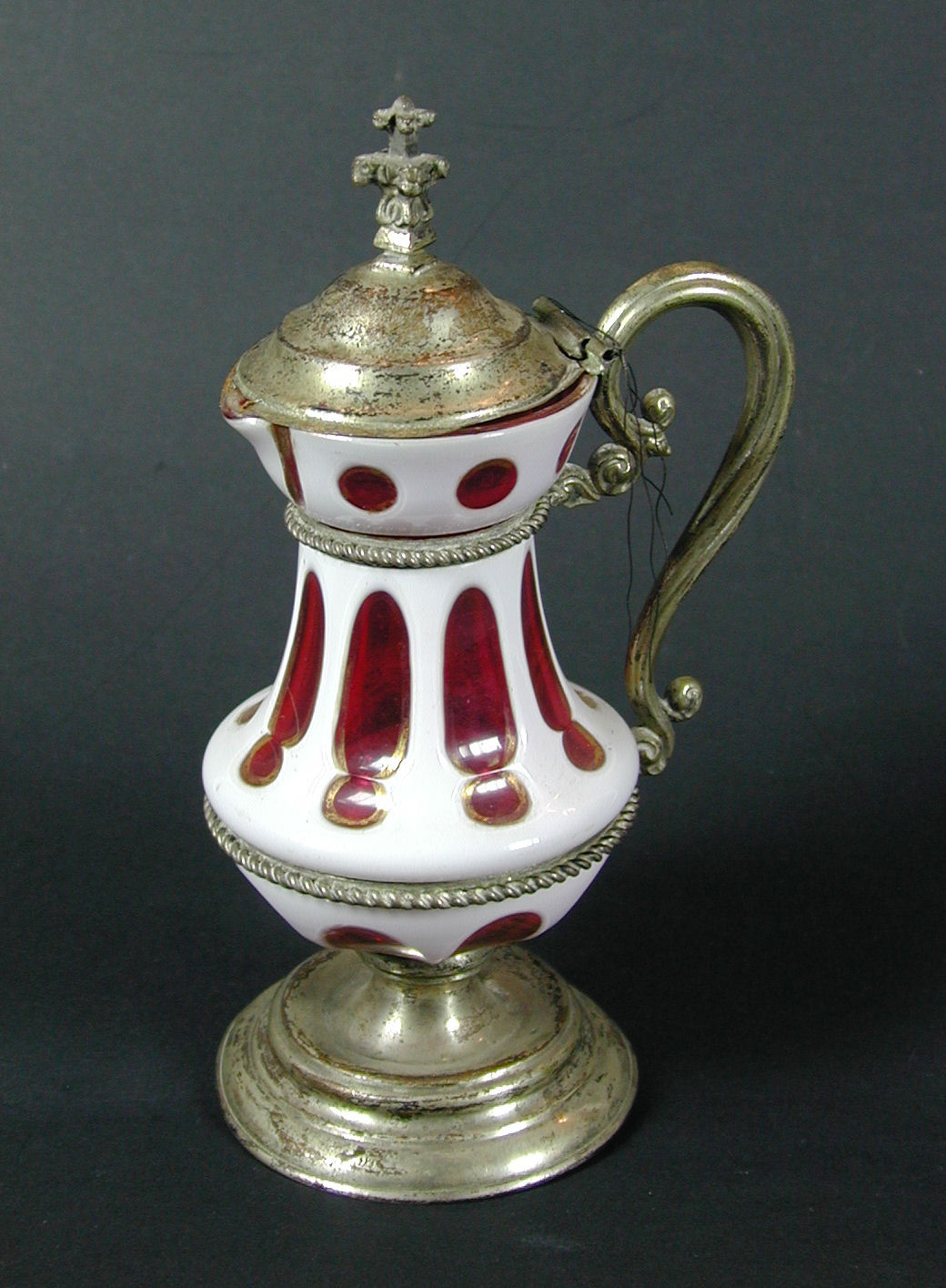 Ampul van wit met rood glas gevat in metaal, met de letter V (vinum)