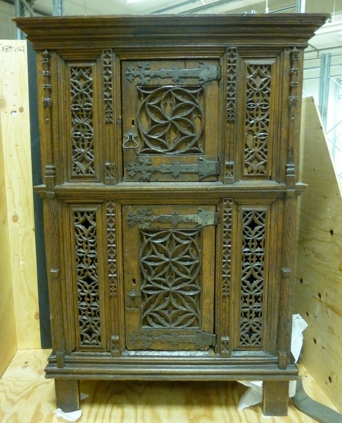 Kastje in gotische stijl met houtsnijwerk en twee deurtjes boven elkaar