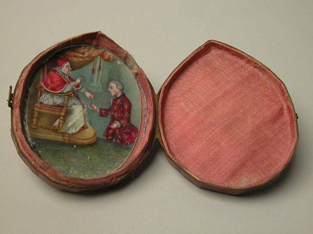 Ivoor achter glas in etui met paus Benedictus XIV die een bidsnoertje geeft aan Pierre-André Stedde