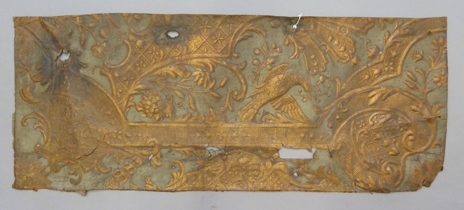 Fragment goudleer met geponsd Louis XIV-patroon, vogel met bloemtakken, ontwerp Daniël Marot