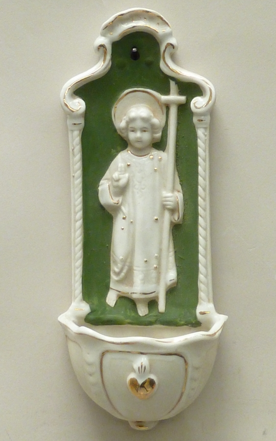 Wijwaterbakje met Christuskind tegen groene achtergrond