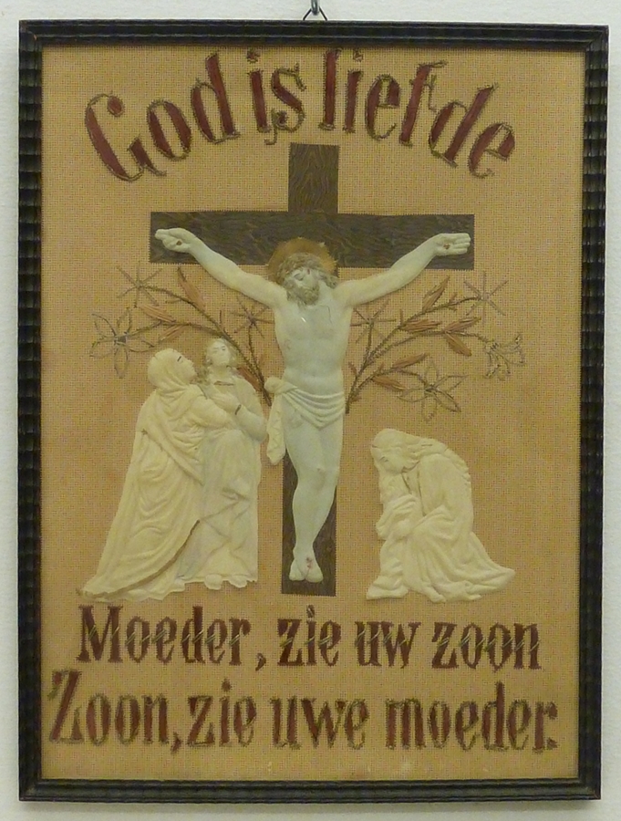 Voorstelling met Calvarie op stramienkarton, met "God is liefde, Moeder zie Uw Zoon ..."