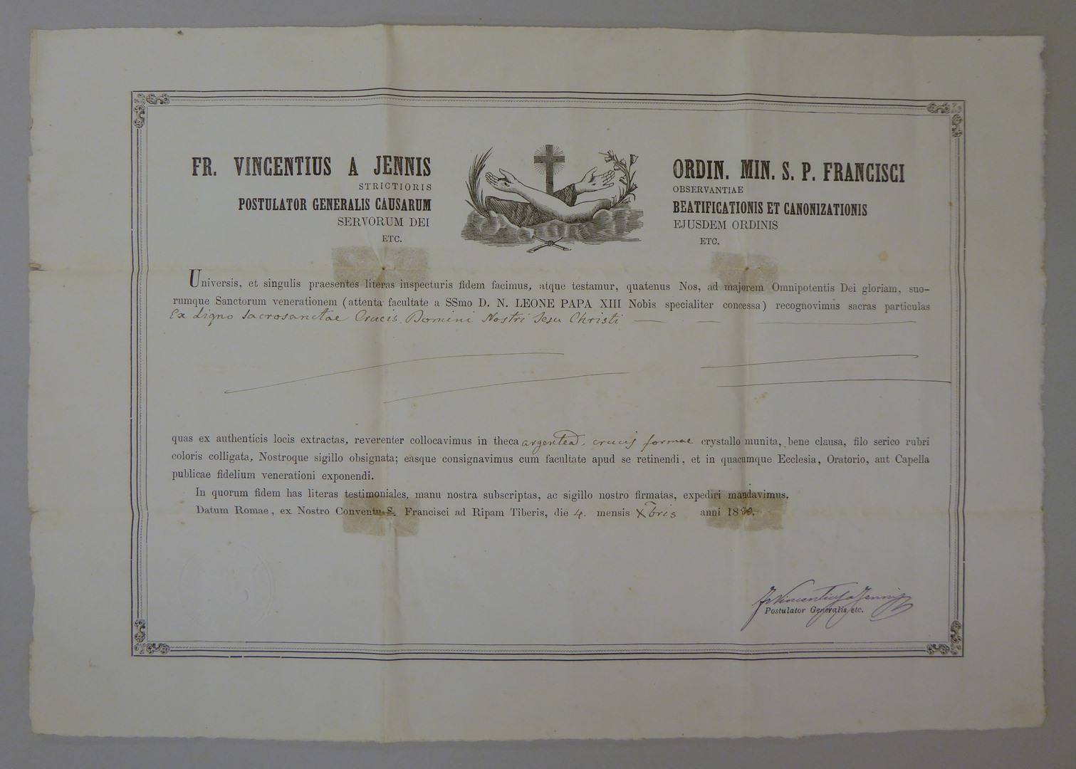 Echtheidsverklaring bij ABM v189g met "Fr. Vincentius a Jennis ..."