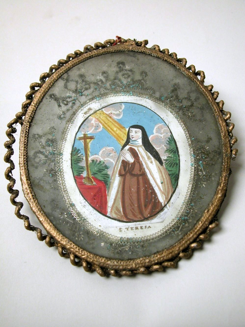 Heiligdom met de H. Teresa van Avila geknield voor een crucifix, met op de achterzijde relieken