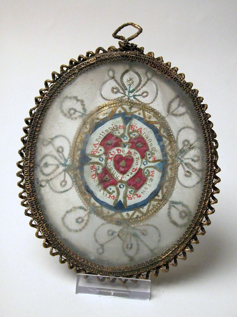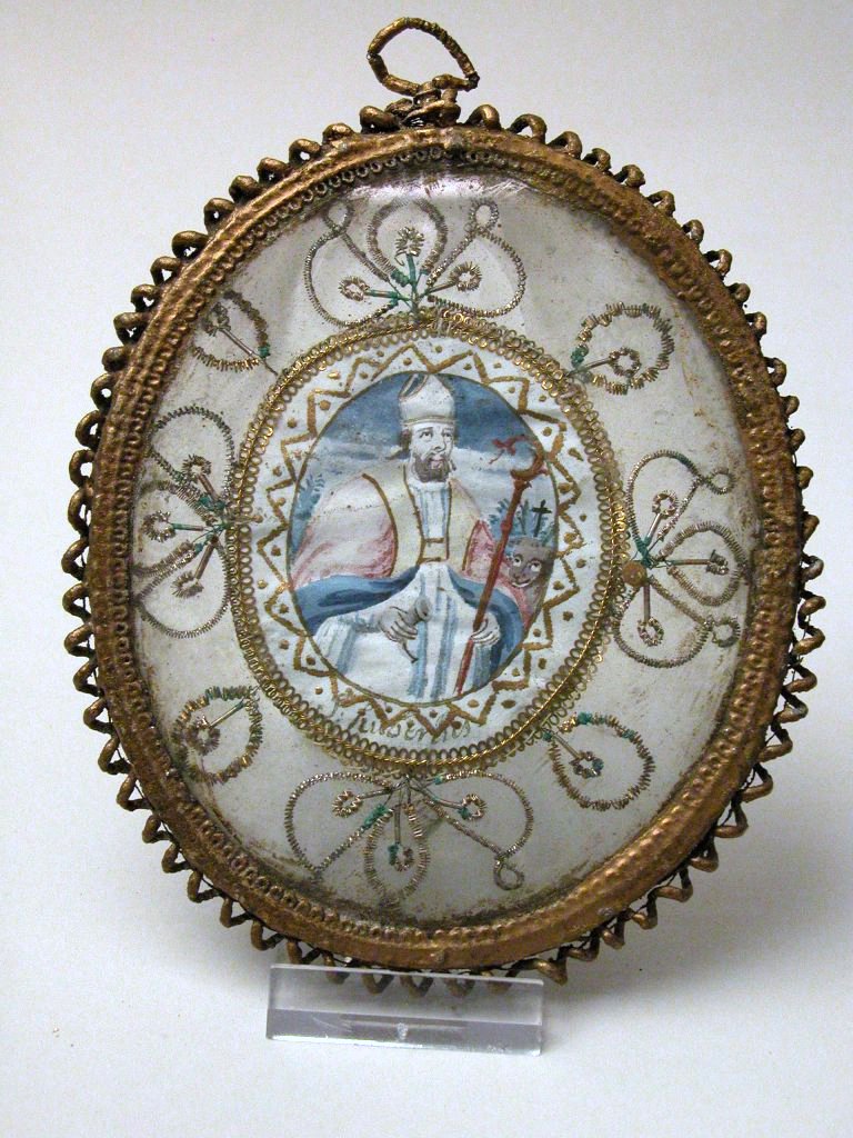 Heiligdom met St. Hubertus met staf en witte mijter, met op de achterzijde relieken