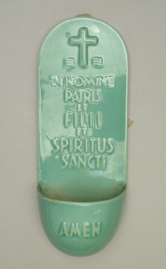 Wijwaterbakje in lichtgroen met kruis en tekst "In Nomine Patris ... et Spiritus Sancti Amen"