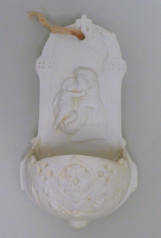 Wijwaterbakje in wit met St. Antonius en het Christuskind