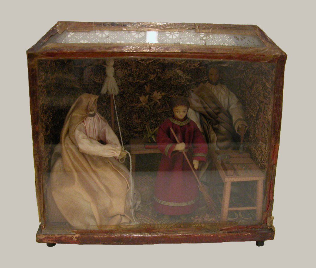 Diorama met poppen van Christus, Maria en Jozef in timmerwerkplaats met glasplaat aan voorzijde