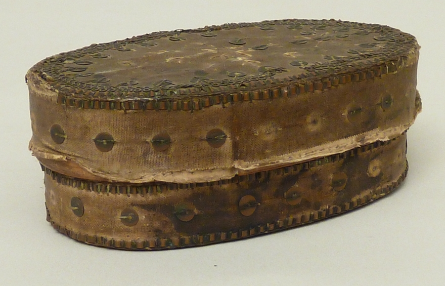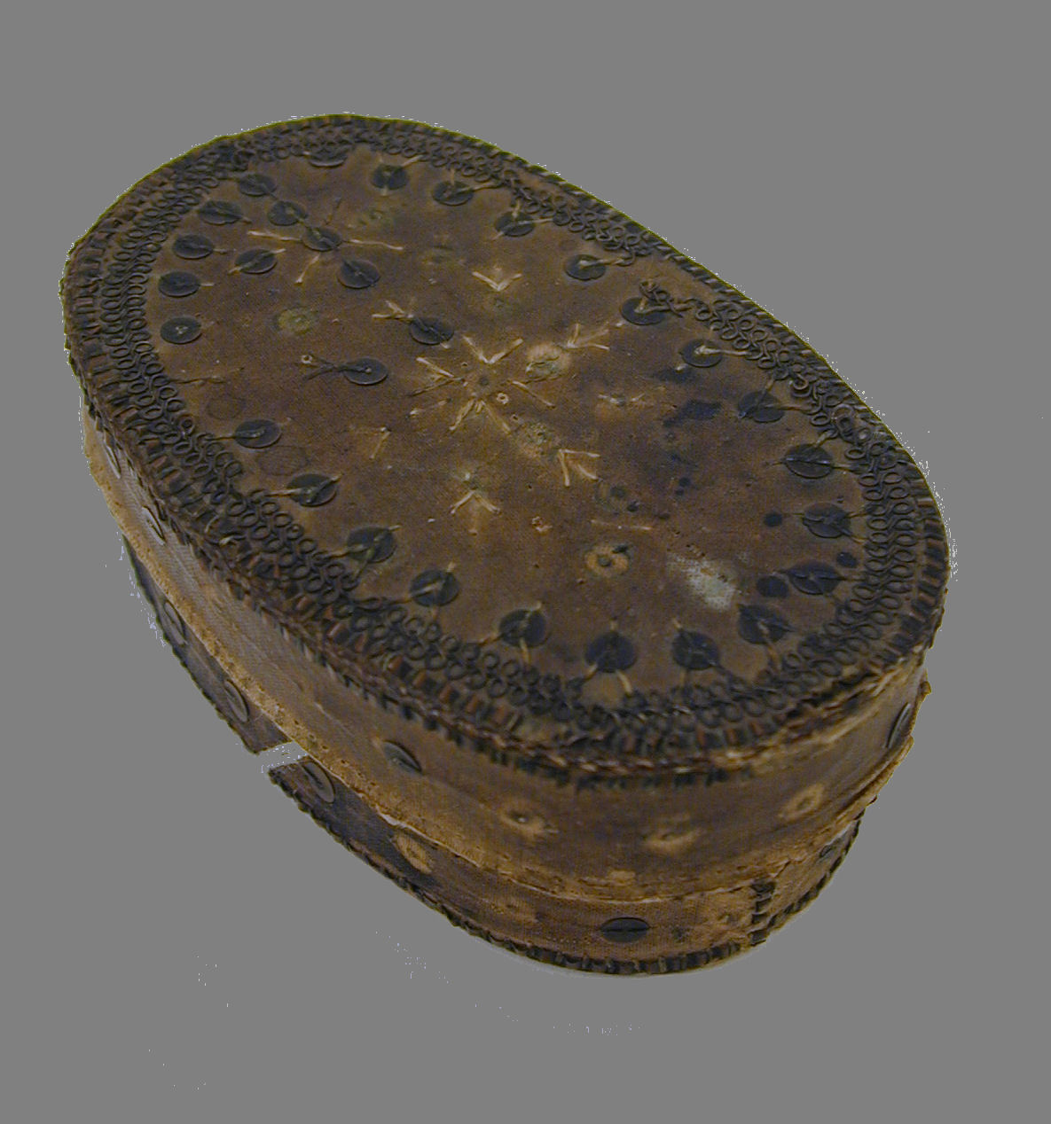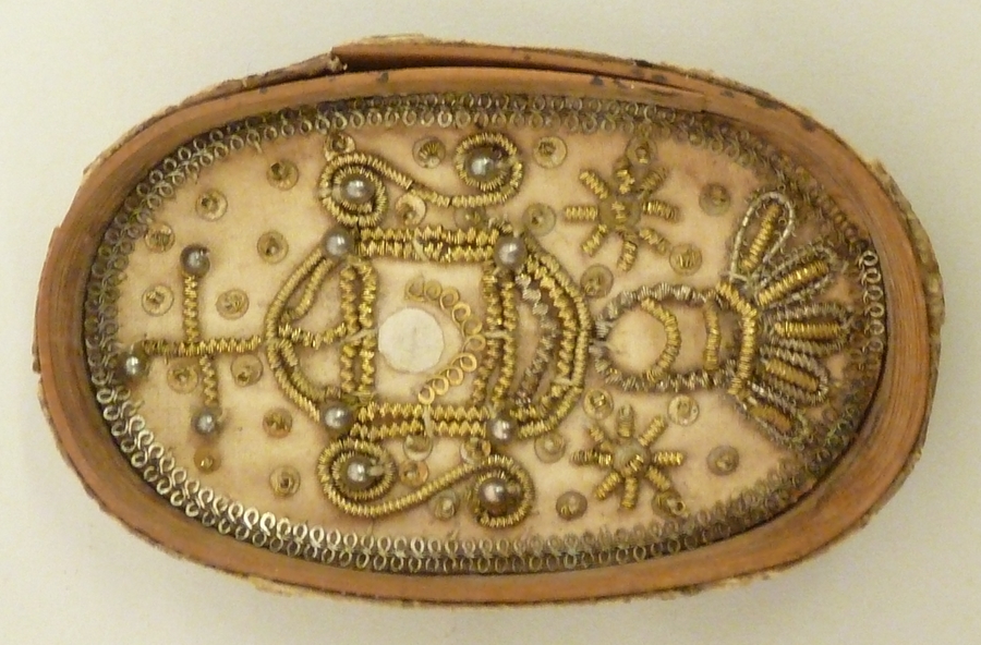 Spanen doos met beeldje van Maria met kind, aan binnenzijde deksel geborduurde monstrans
