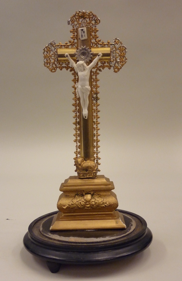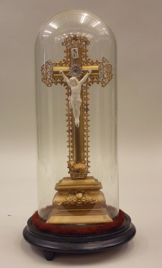 Kruisbeeld op voet met corpus van biscuit onder stolp
