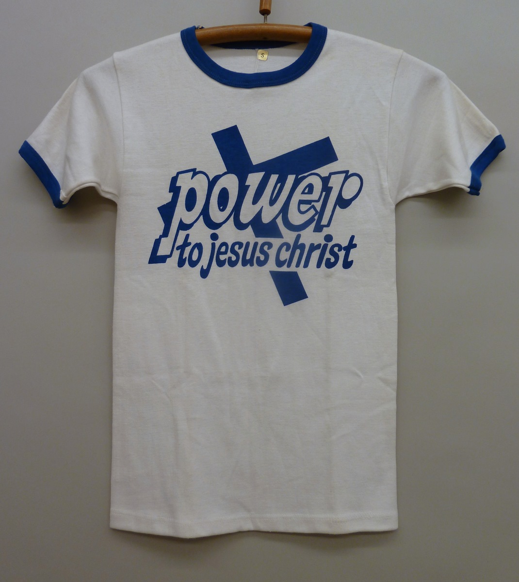 Wit T-shirt met blauwe opdruk "Power to Jesus Christ"