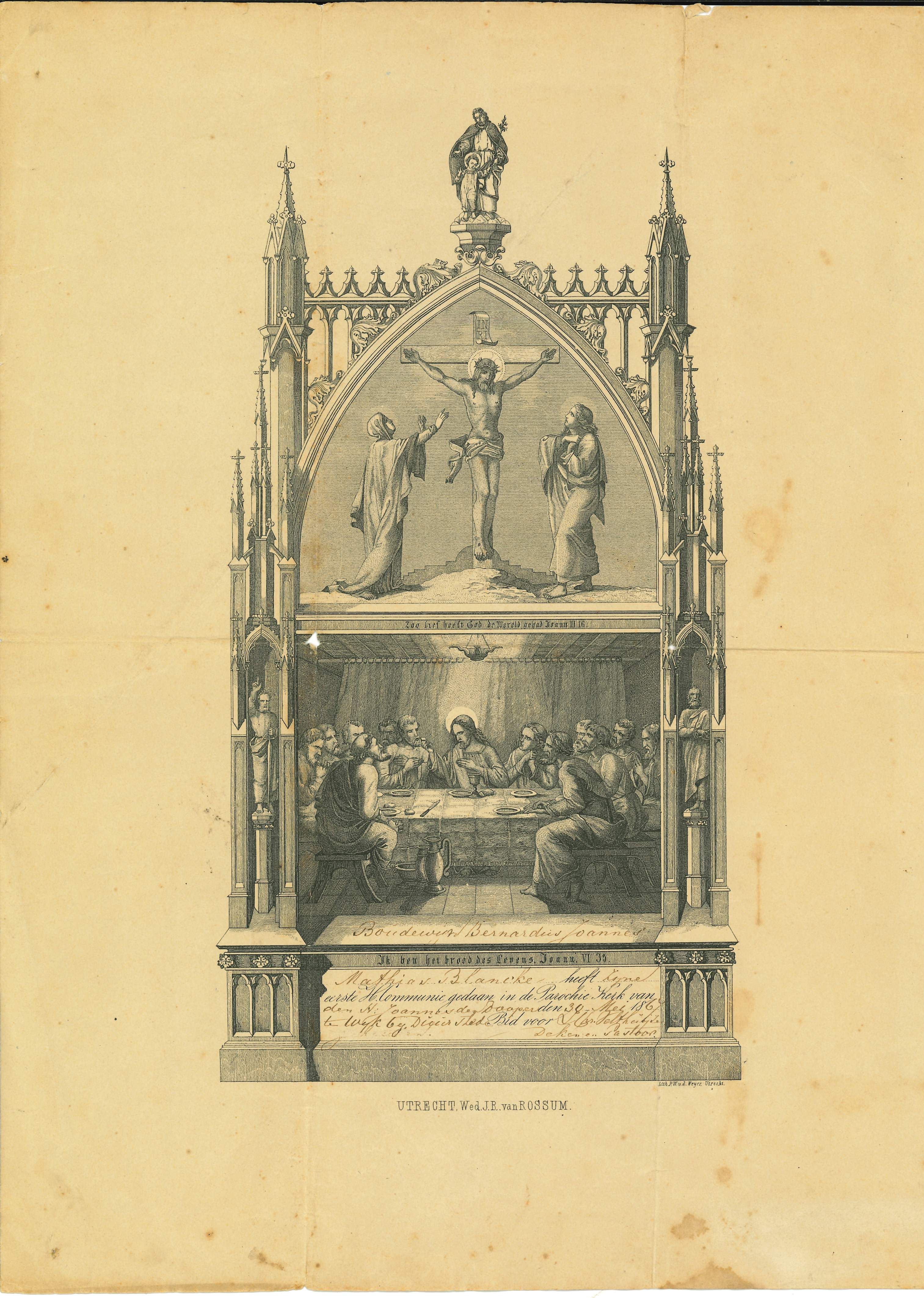 Communieprent met Christus aan het kruis en laatste avondmaal, van Boudewijn Bernardus Joannes Mathias Blancke, 30 mei 1867 te Wijk bij Duurstede