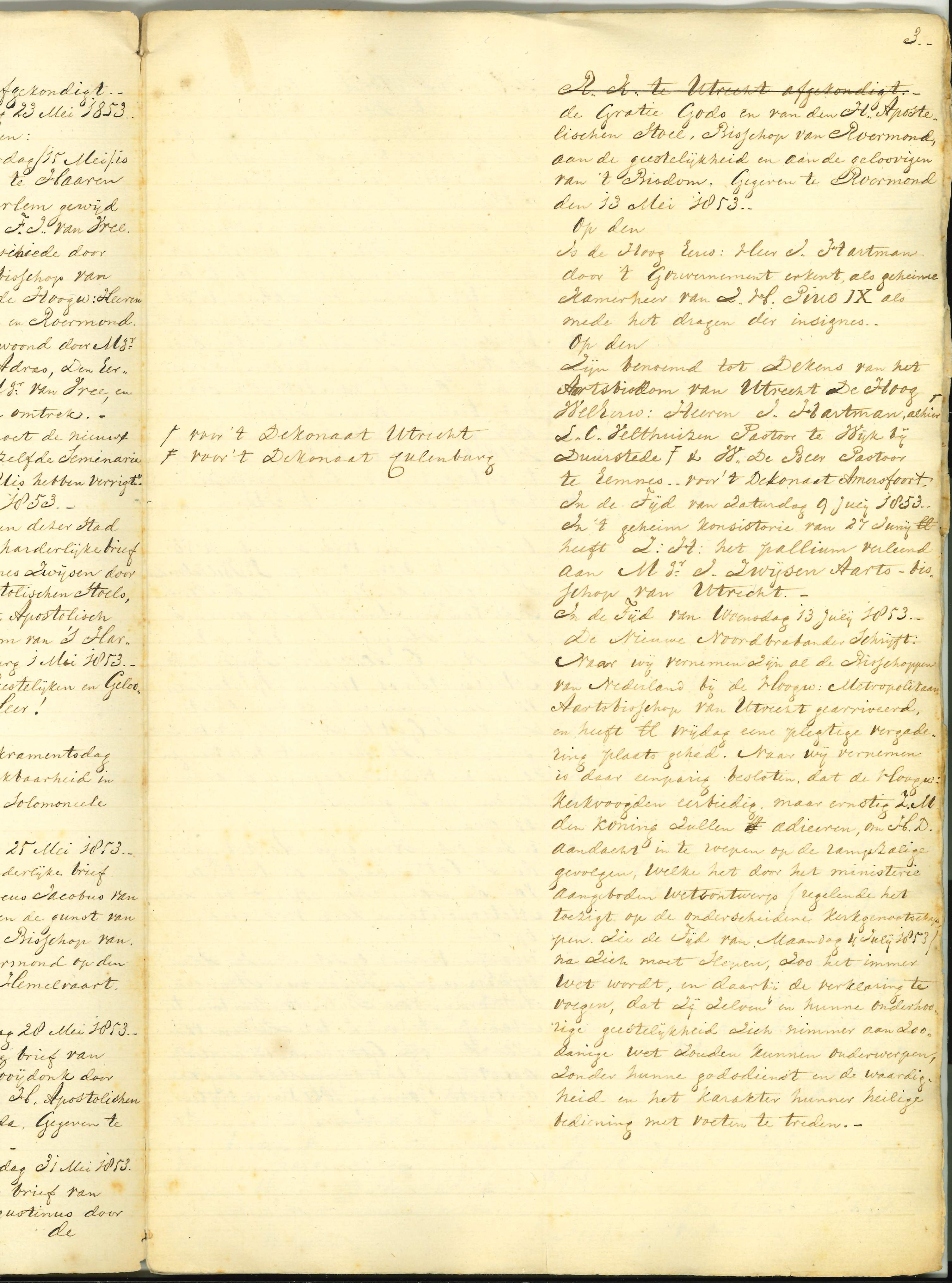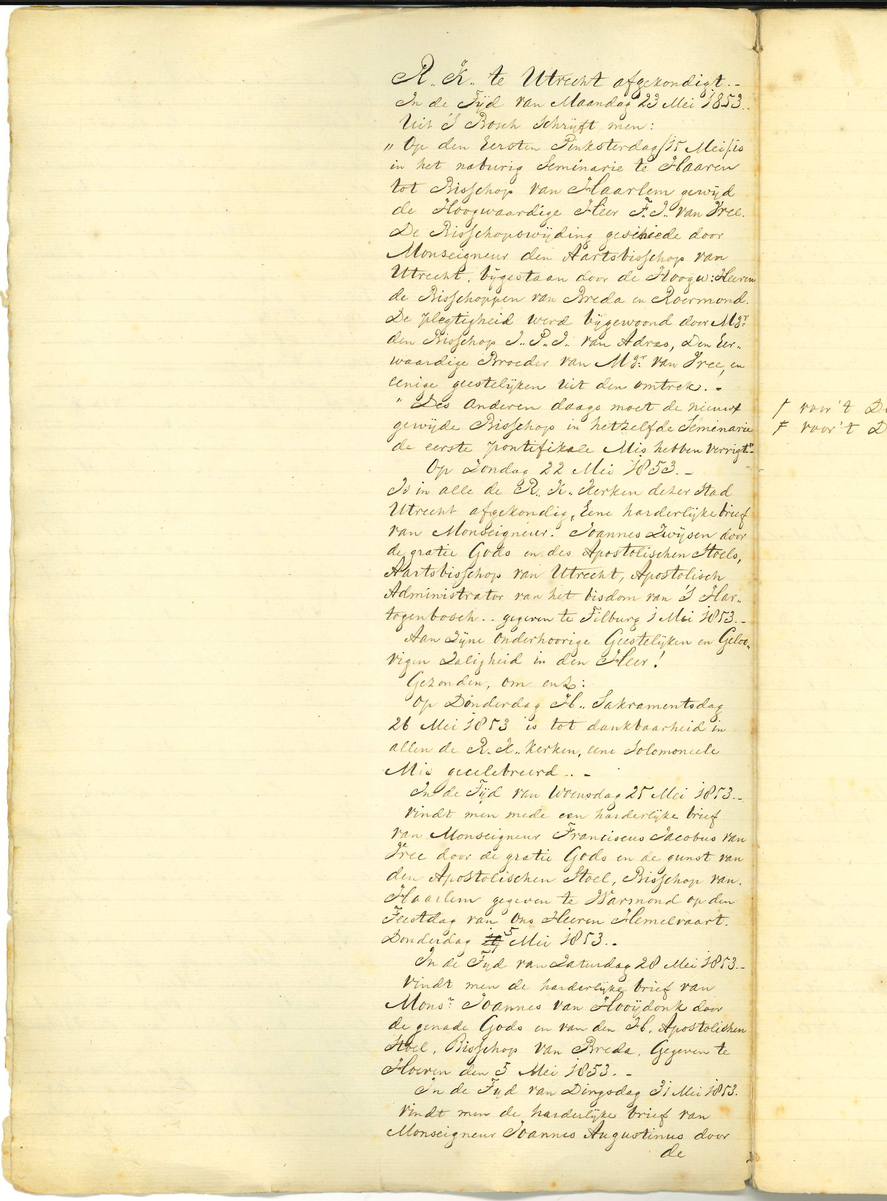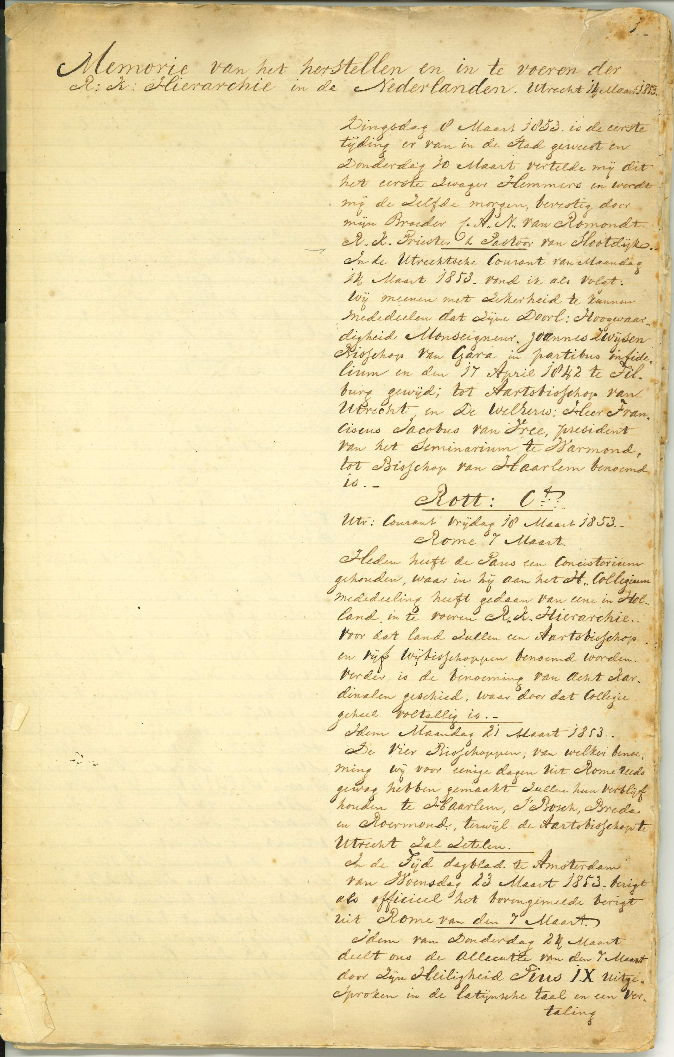 Beschrijving van kerkelijke gebeurtenissen, in het bijzonder in Utrecht, periode 1853-1873, waaronder het herstel bisschoppelijke hiërarchie 1853