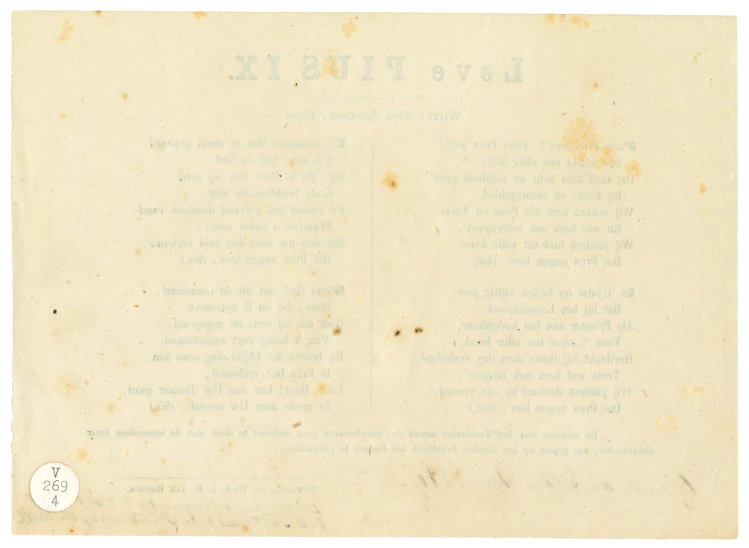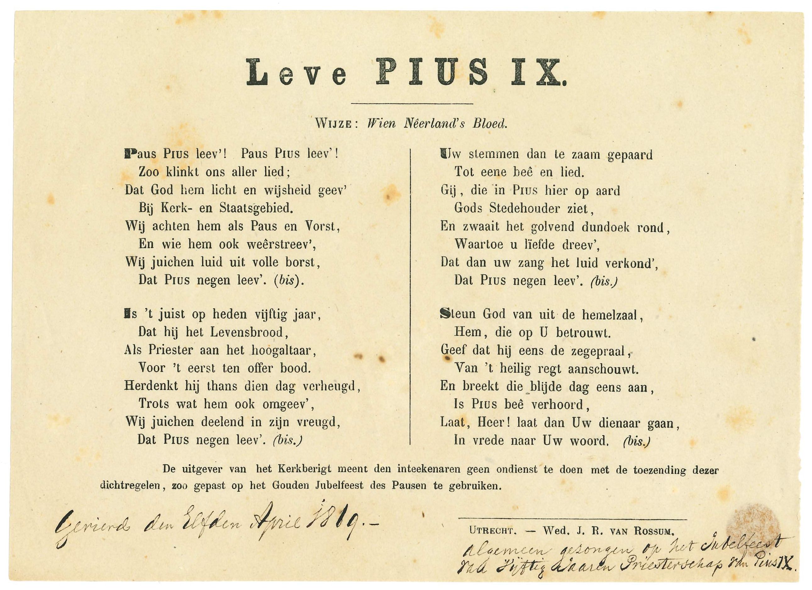 Tekst van feestlied 'Leve Pius IX' bij gelegenheid van zijn 50-jarig priesterschap, op wijs van 'Wien Neêrlands bloed'