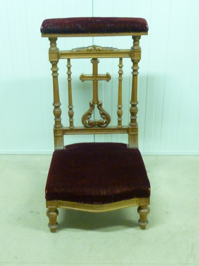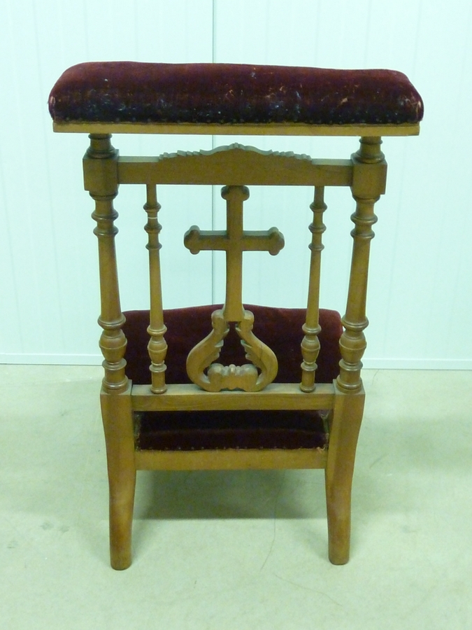 Bidstoel met rode bekleding en open houtwerk met in het centrum een kruis