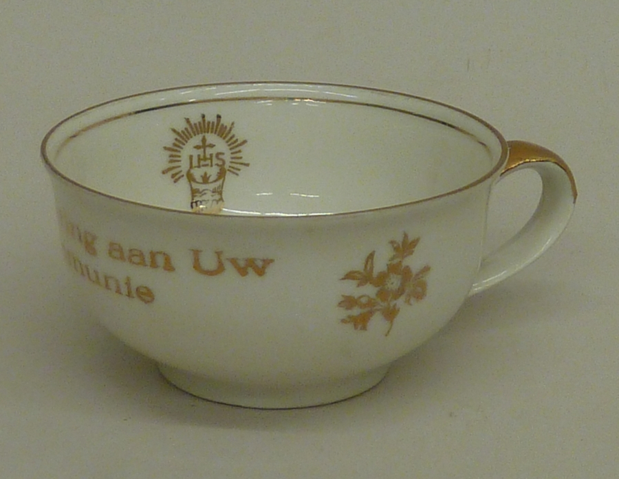 Kop met "Ter herinnering aan uw H. Communie" en kelk met IHS in goud aan binnenzijde