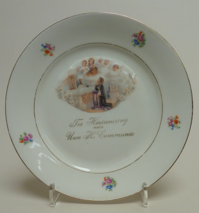 Bord met knielende jongeling voor altaar met "Ter Herinnering aan Uwe H. Communie"