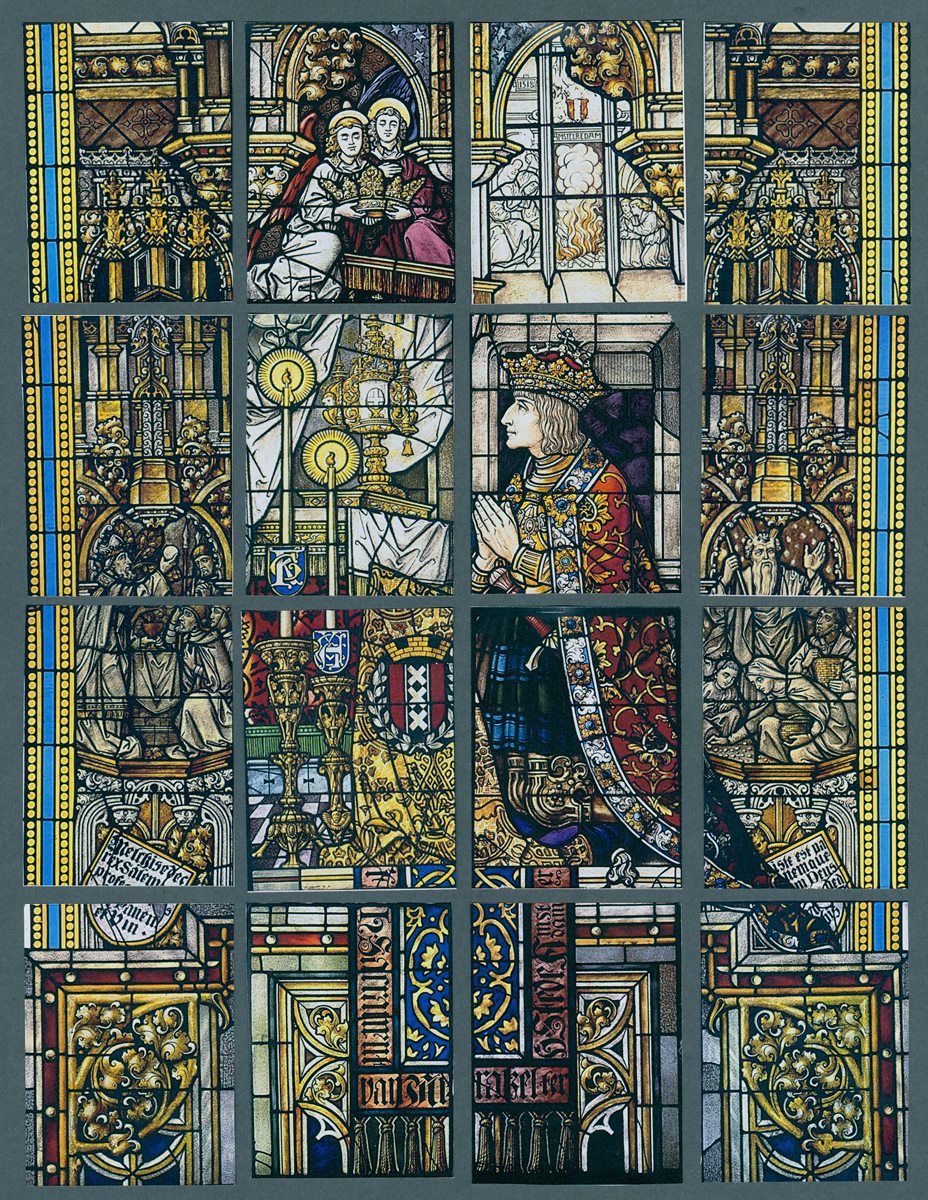 Raam met keizer Maximiliaan voor het Sacrament Mirakel (Utrecht, O.L. Vrouw ten Hemelopnemingkerk): architectonische motieven van baldakijn, versierde blauwe band links