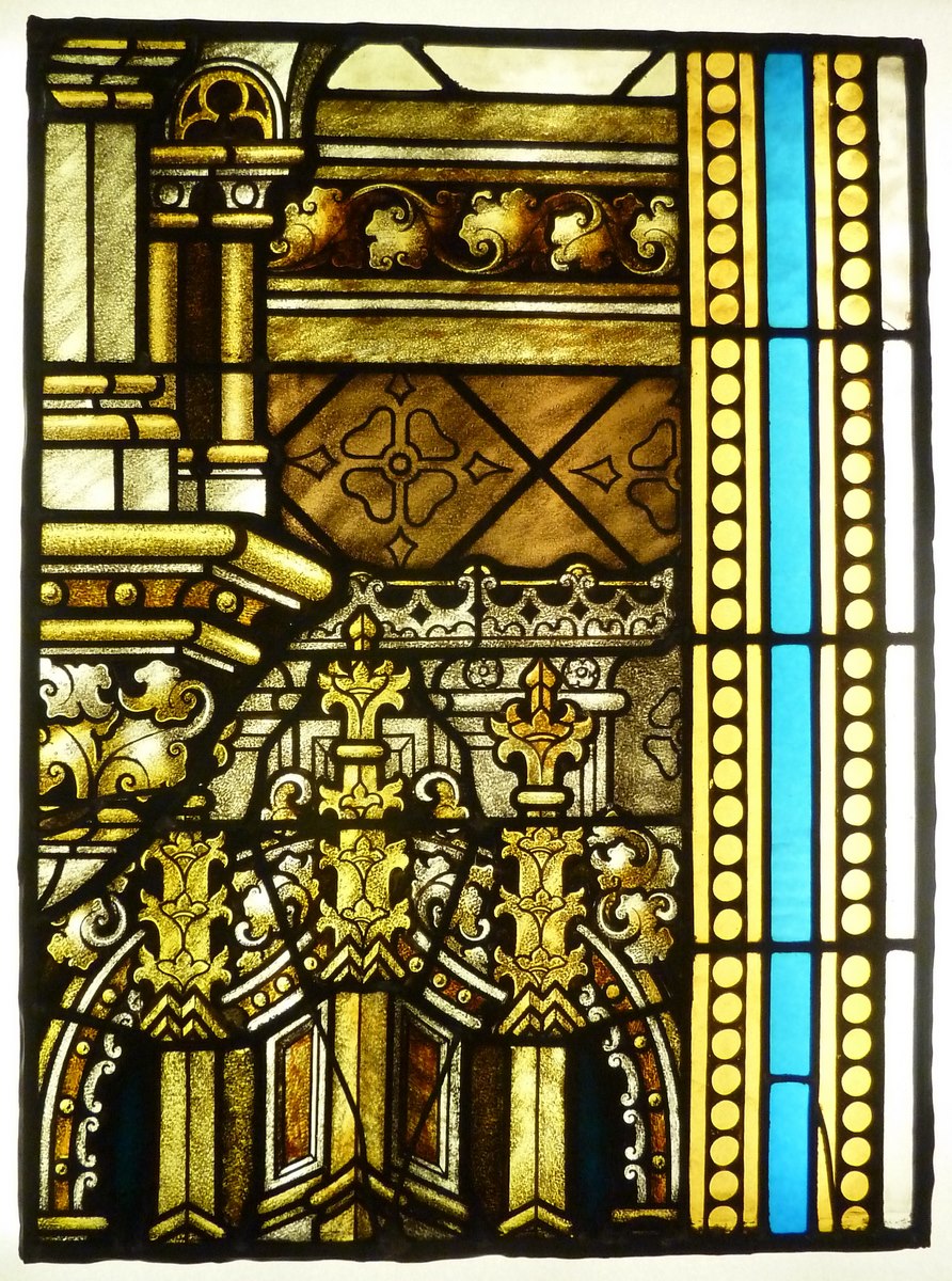Raam met keizer Maximiliaan voor het Sacrament Mirakel (Utrecht, O.L. Vrouw ten Hemelopnemingkerk): architectonische motieven van baldakijn, versierde blauwe band rechts