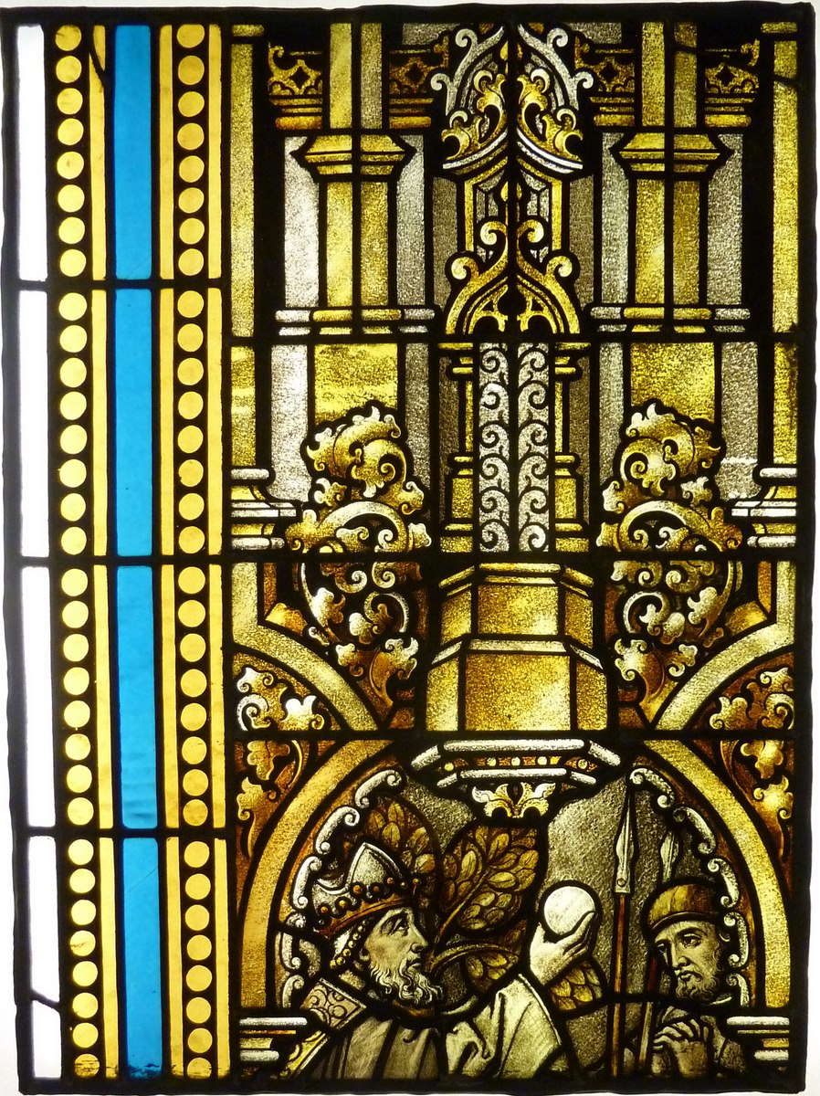 Raam met keizer Maximiliaan voor het Sacrament Mirakel (Utrecht, O.L. Vrouw ten Hemelopnemingkerk): onderaan twee mannenkoppen: bisschop toont hostie, links versierde band