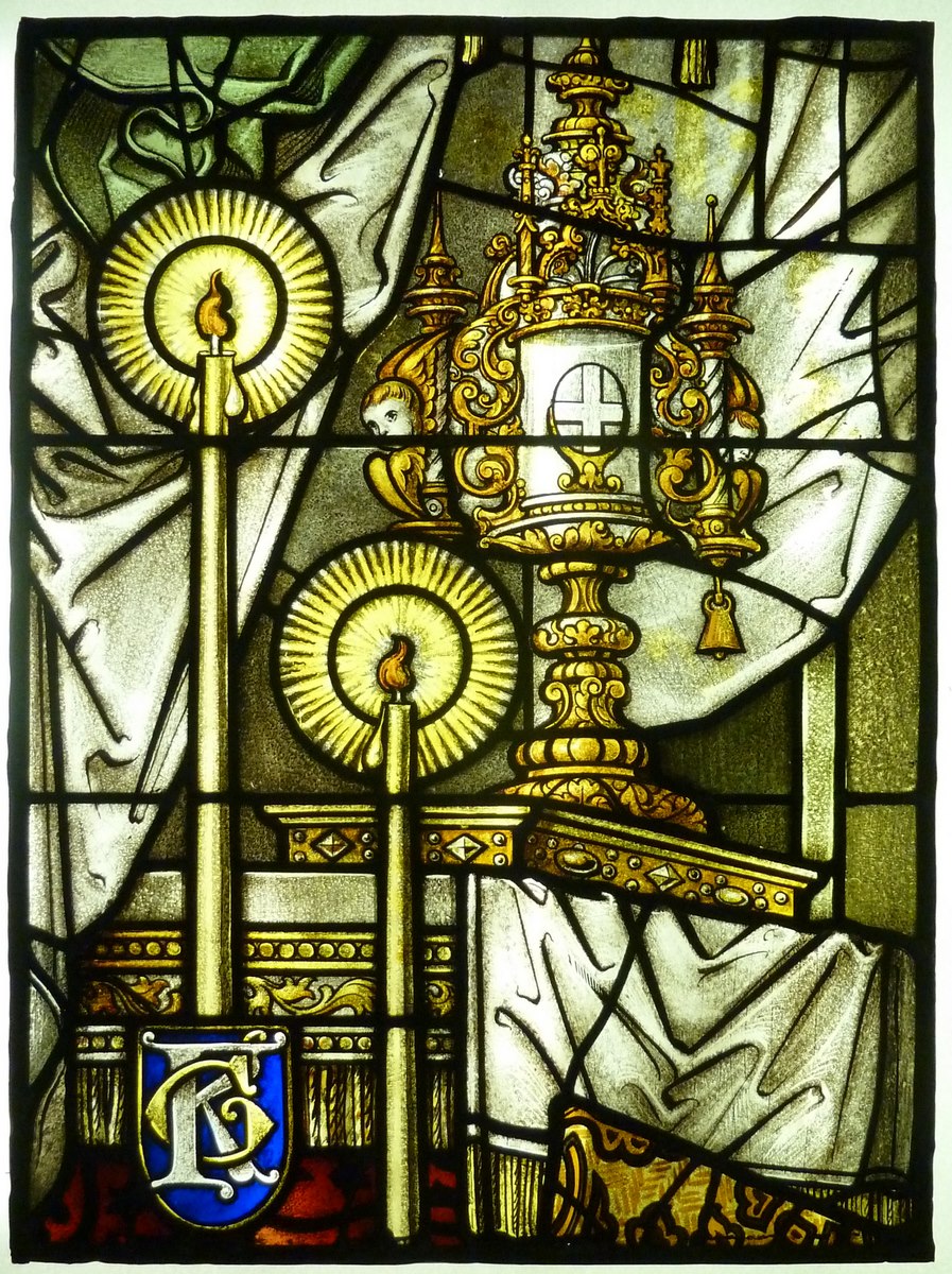Raam met keizer Maximiliaan voor het Sacrament Mirakel (Utrecht, O.L. Vrouw ten Hemelopnemingkerk): monstrans en twee brandende kaarsen