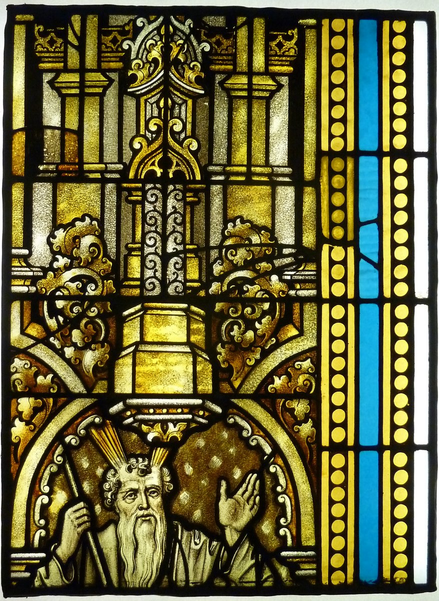 Raam met keizer Maximiliaan voor het Sacrament Mirakel (Utrecht, O.L. Vrouw ten Hemelopnemingkerk): onderaan Mozes, rechts versierde band