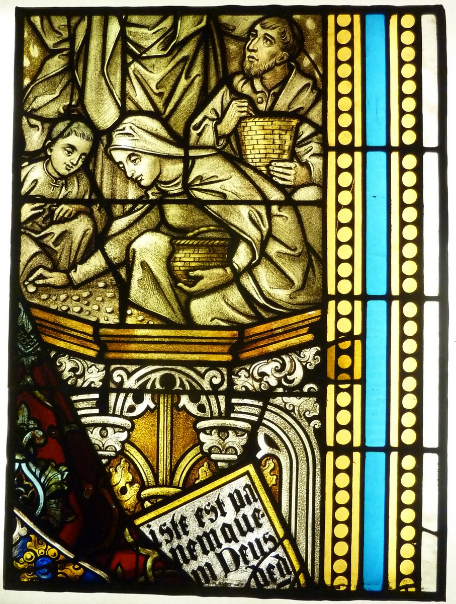 Raam met keizer Maximiliaan voor het Sacrament Mirakel (Utrecht, O.L. Vrouw ten Hemelopnemingkerk): mannaregen in de woestijn met man, vrouw, kind, schild met tekst, rechts versierde band