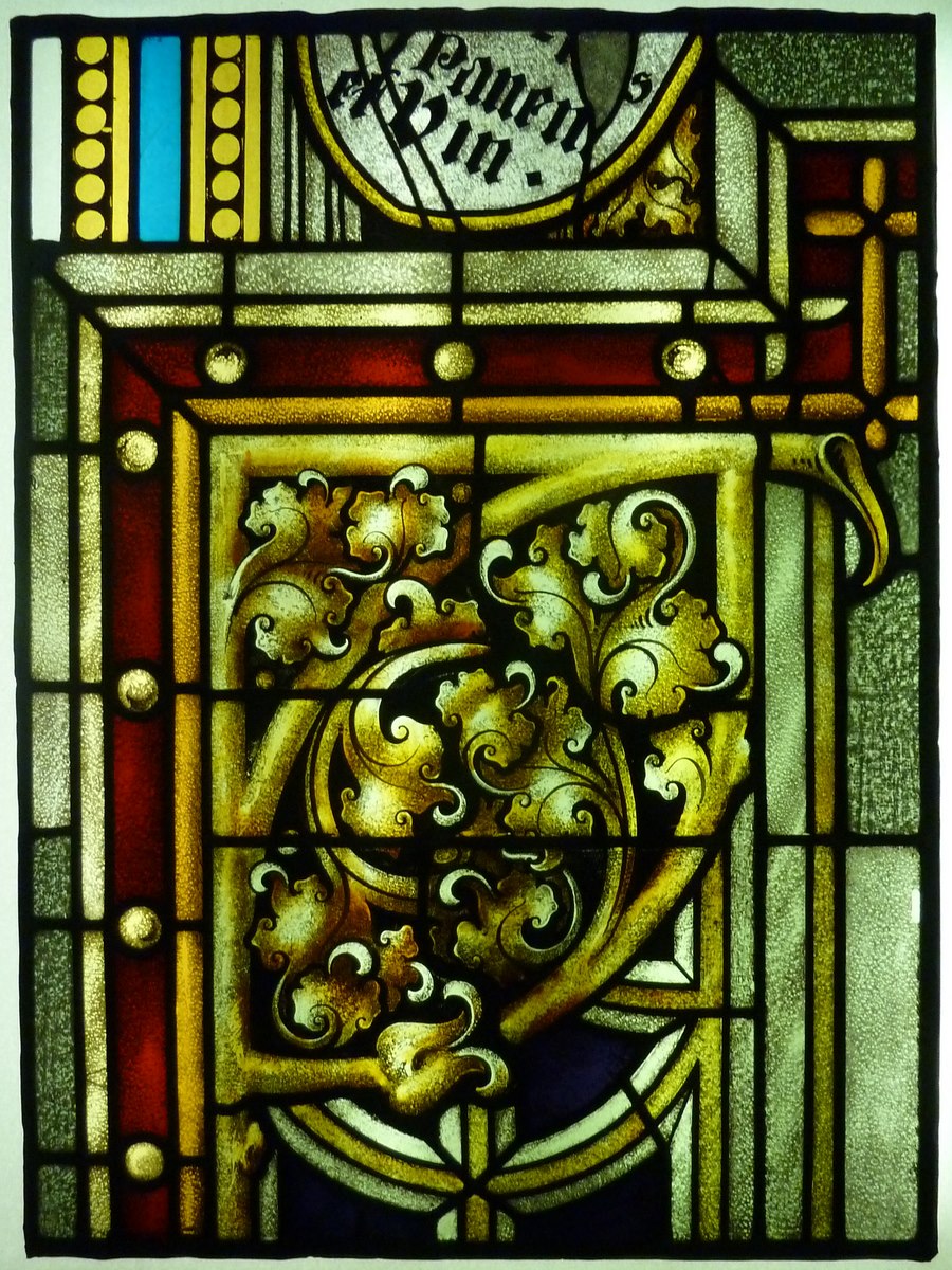 Raam met keizer Maximiliaan voor het Sacrament Mirakel (Utrecht, O.L. Vrouw ten Hemelopnemingkerk): florale motieven en deel van schild met tekst