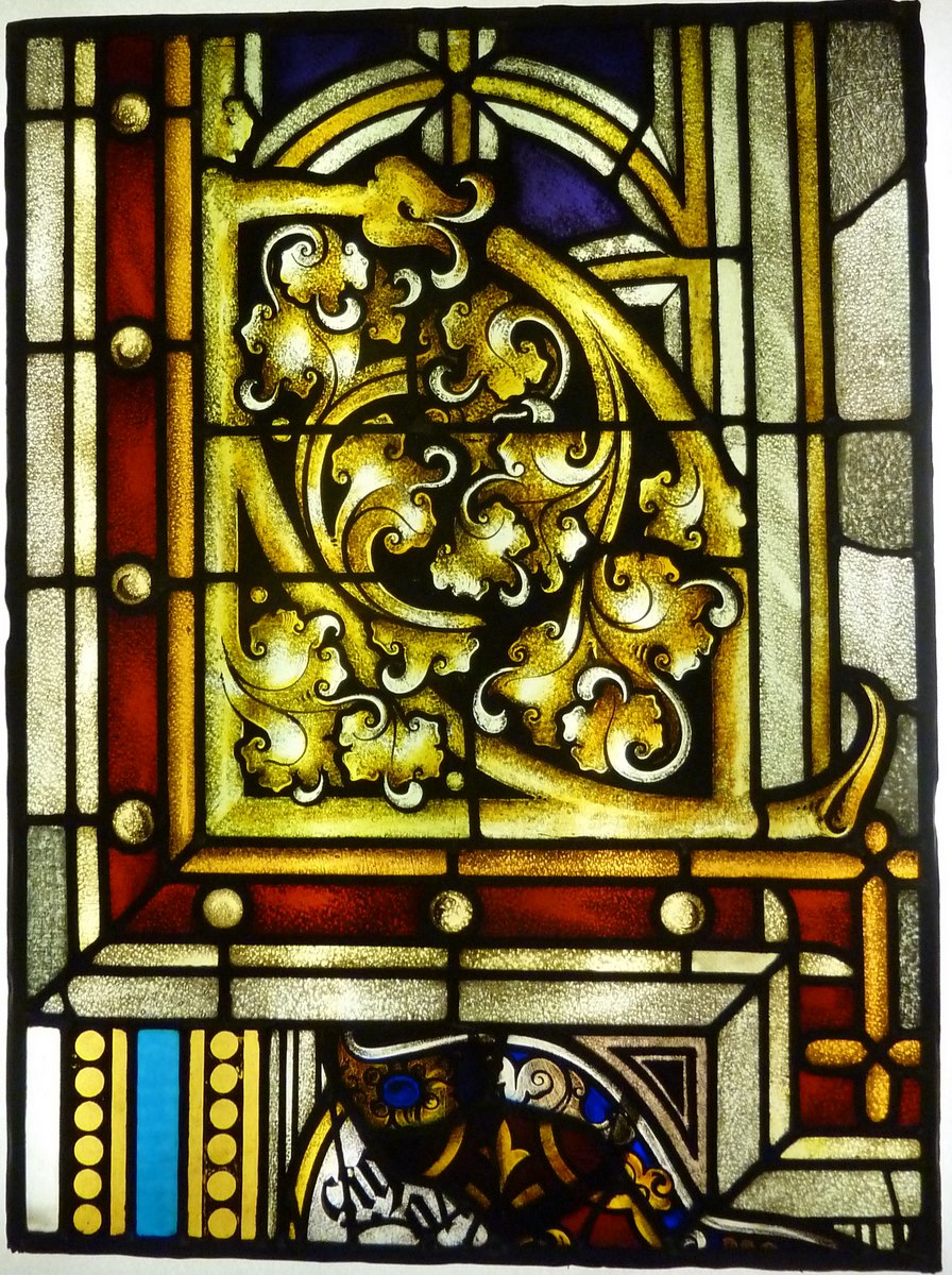 Raam met keizer Maximiliaan voor het Sacrament Mirakel (Utrecht, O.L. Vrouw ten Hemelopnemingkerk): florale motieven, deel van schild met tekst