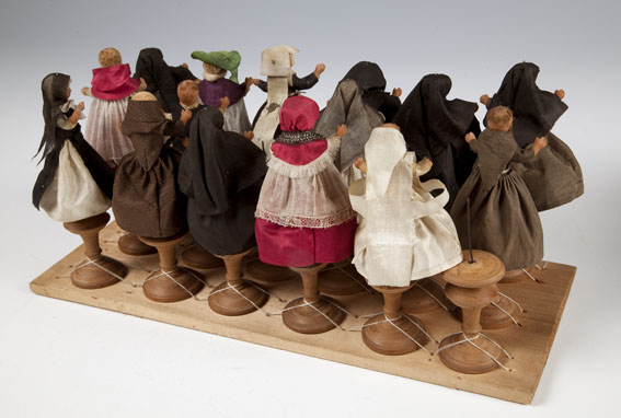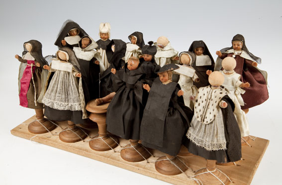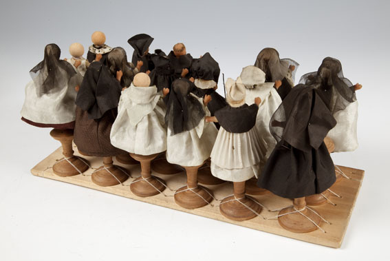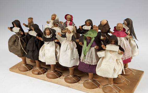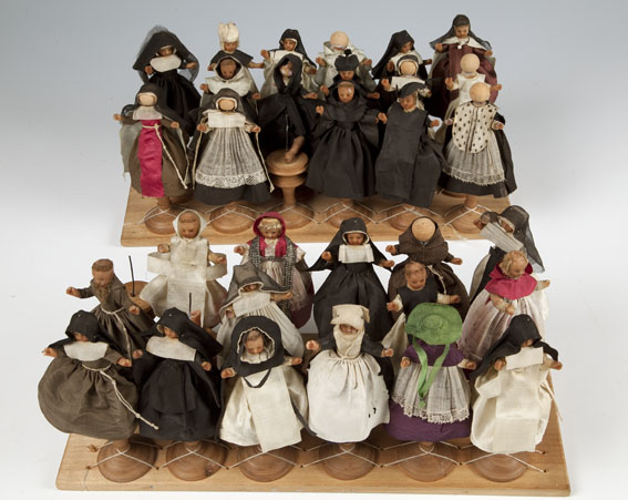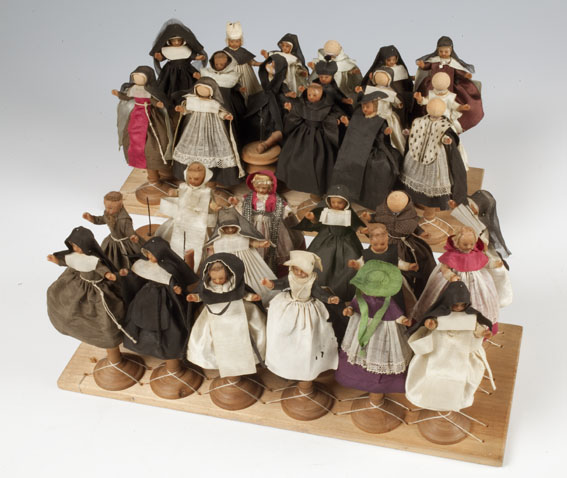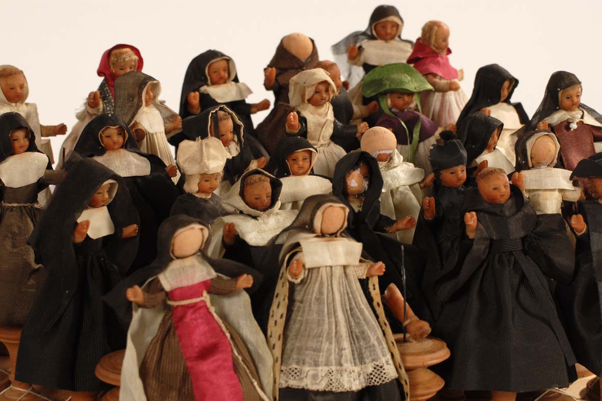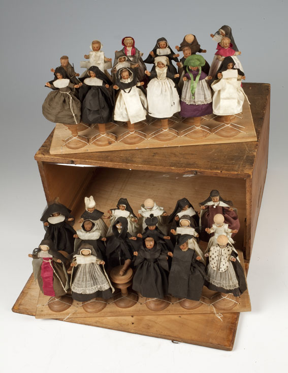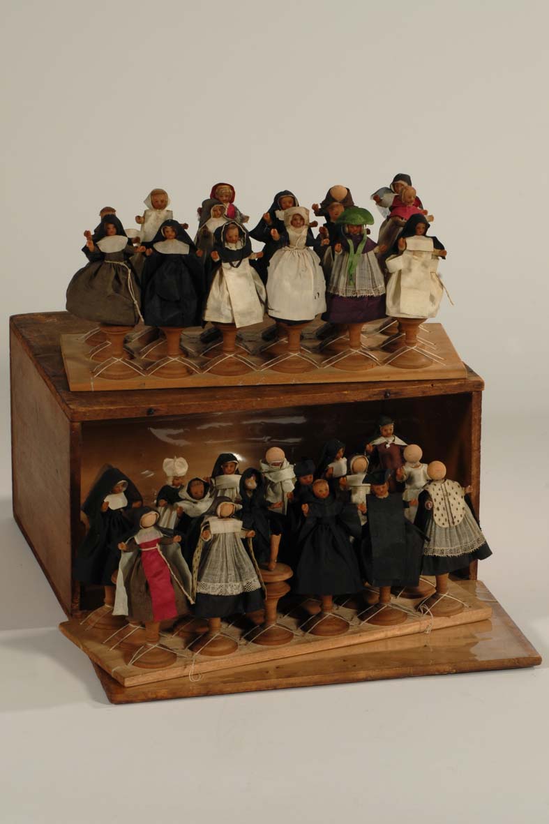 Twee plateaus met eenendertig modellen van typen ordekleding in een kist
