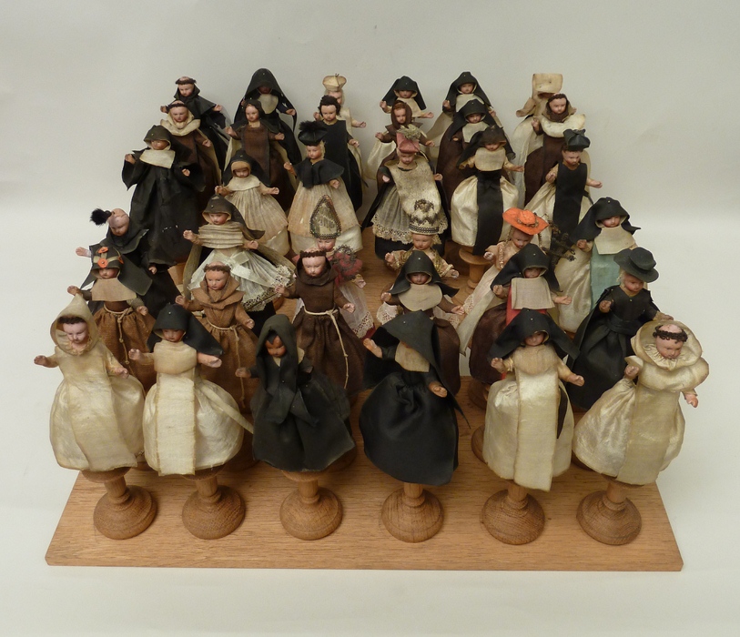 Twee plateaus met telkens achttien modellen van typen ordekleding in een kist