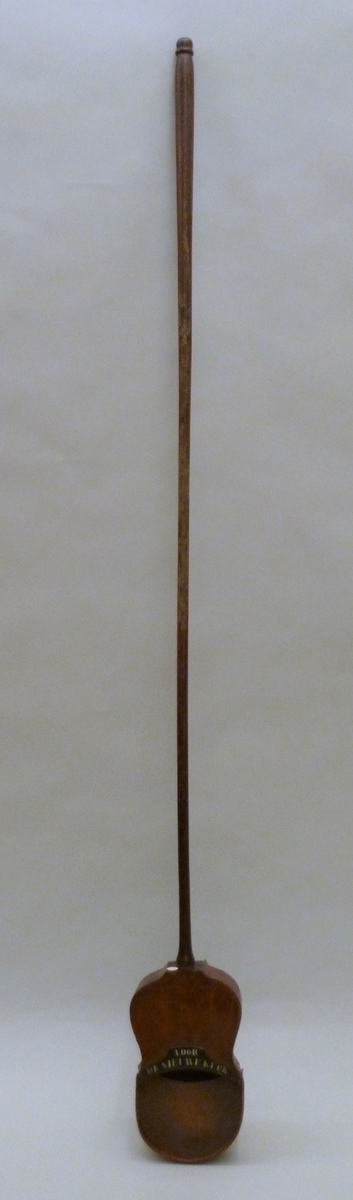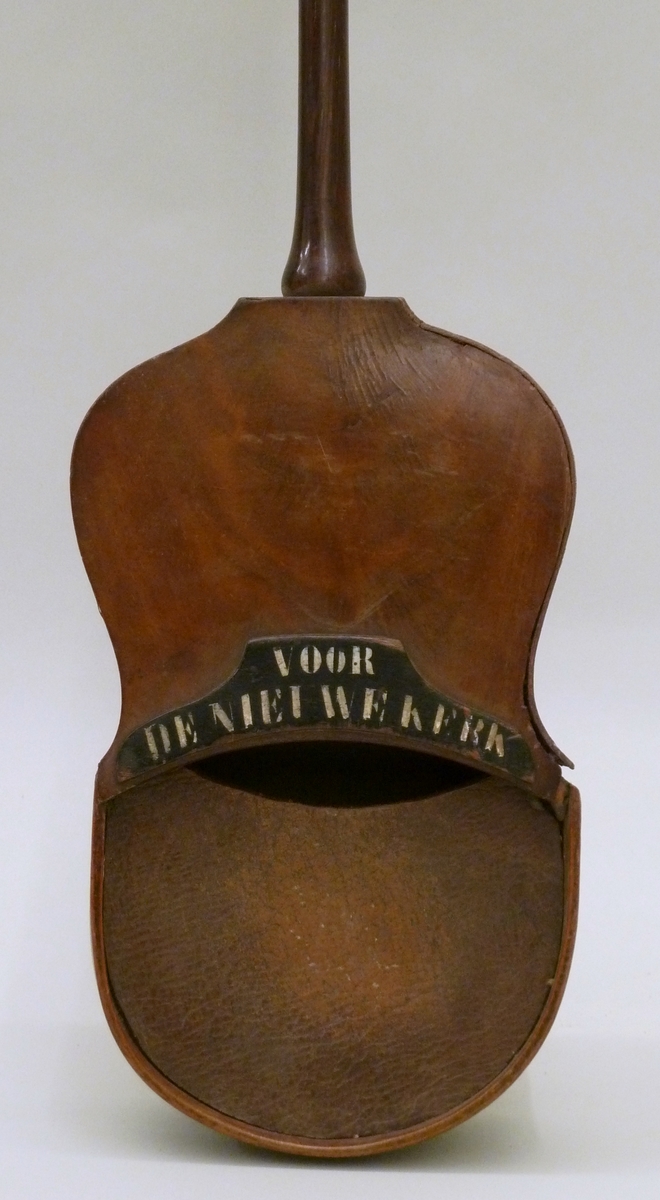 Collectebak met lange steel met opschrift "voor de nieuwe kerk"