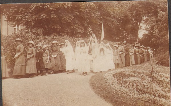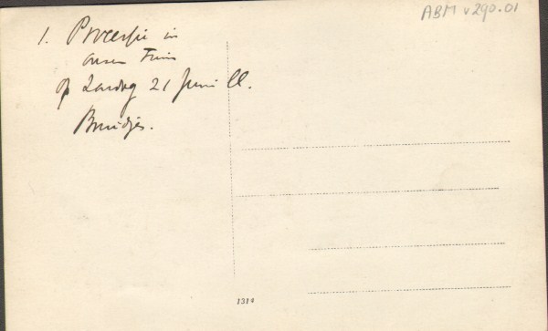 Op de achterzijde is de volgende tekst geschreven: 1. Processie(?) in onzen tuin op zondag 21 juni ll. Bruidjes.