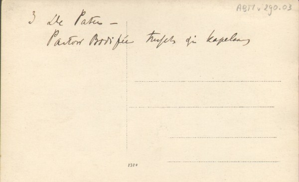 Op de achterzijde is de volgende tekst geschreven: 3. Pastoor Bodifée tusschen z'n kapelaans
