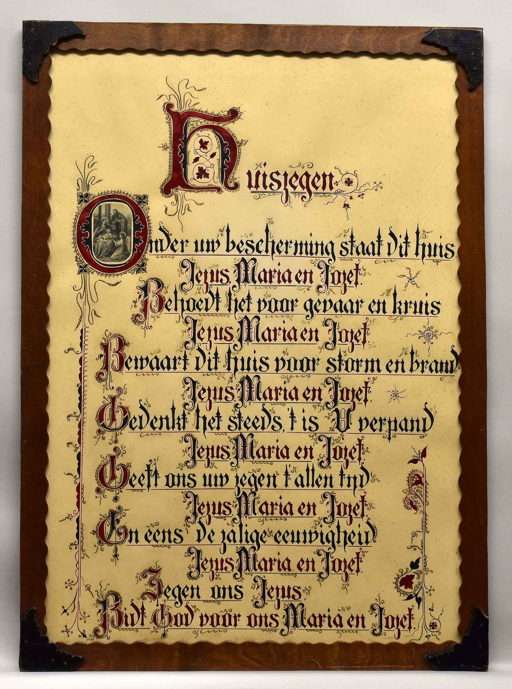 Huiszegen in lijst met tekst waarvan initiaal is versierd met plaatje van H. Familie