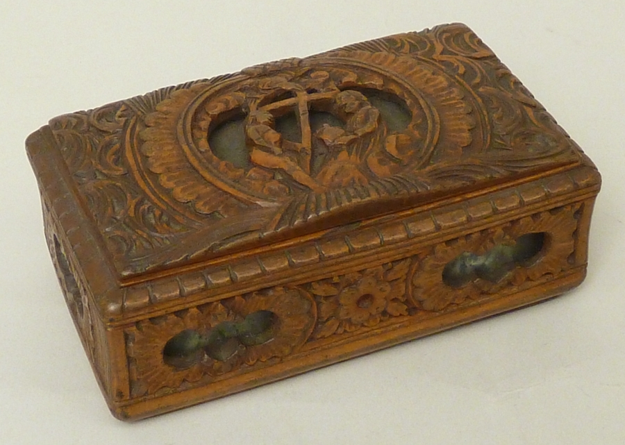 Snuifdoos met snijwerk waarin afgebeeld H. Drie-eenheid, aan binnenzijde deksel een spiegeltje
