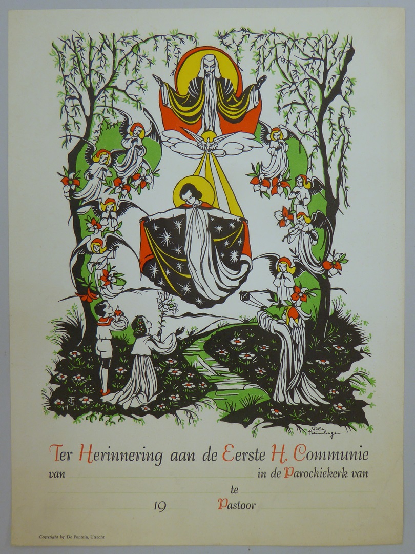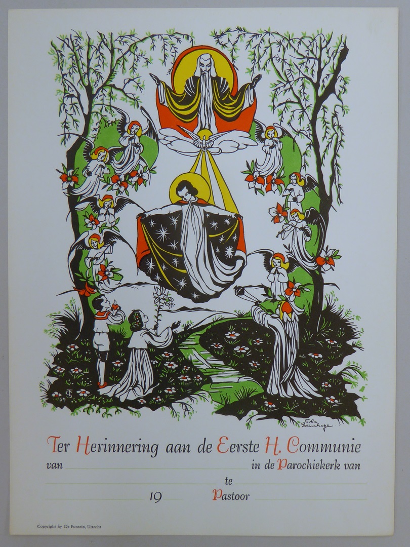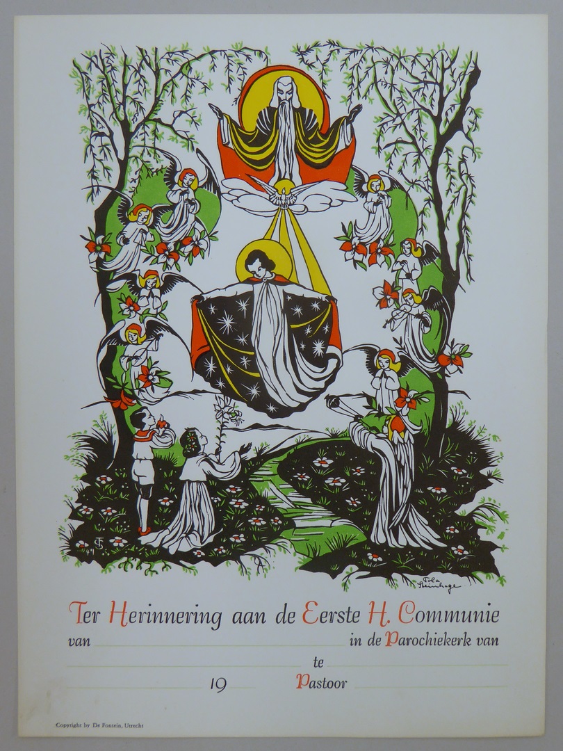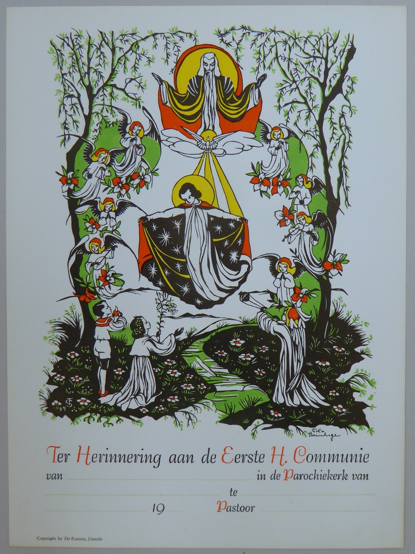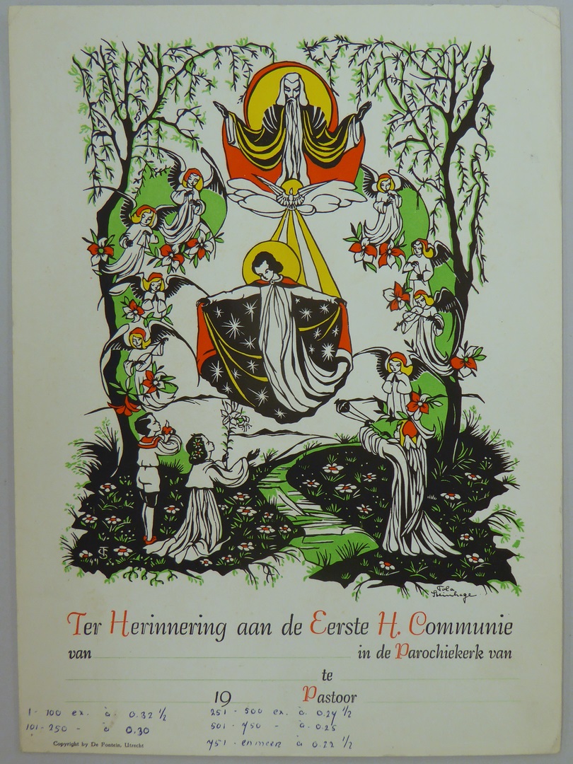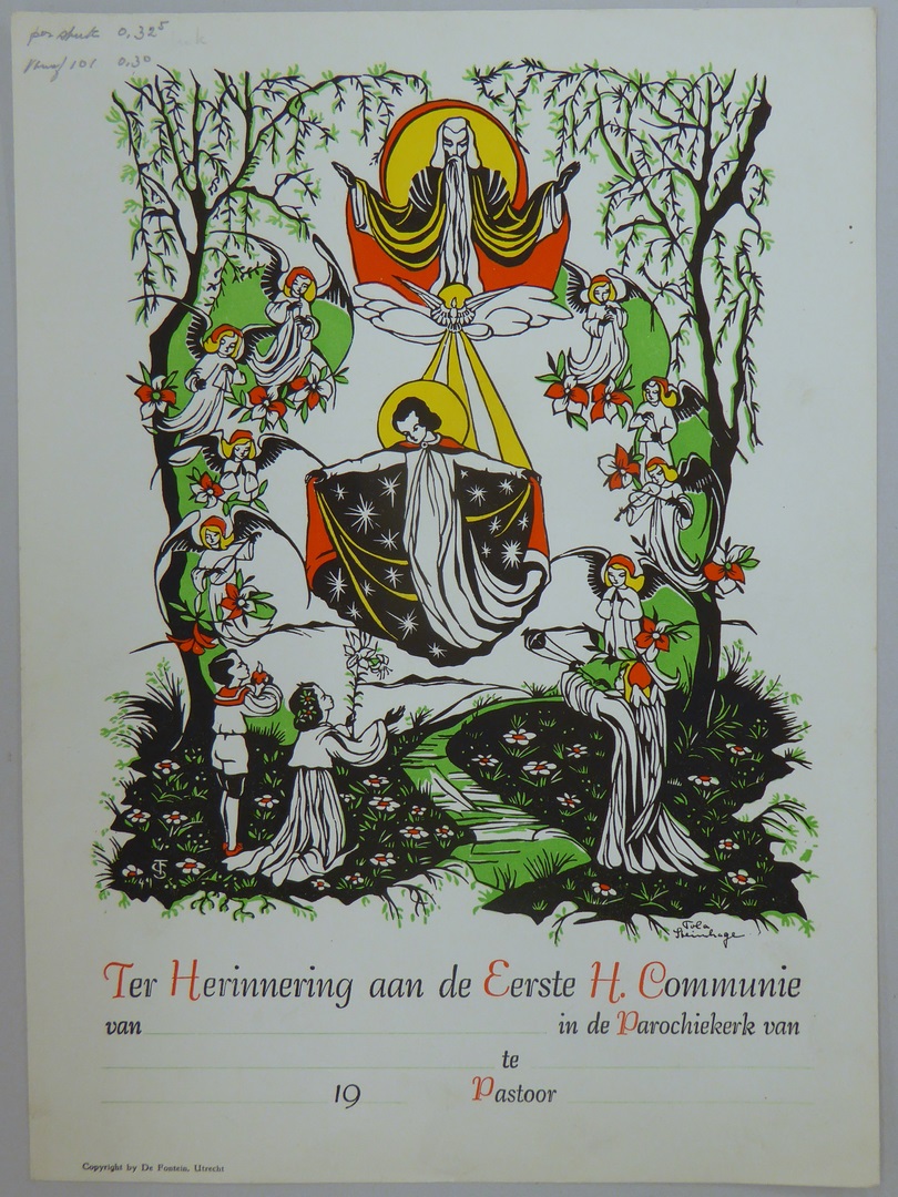 Communieprent (18 stuks) met H. Drievuldigheid: Christus in sterrenmantel omgeven door engelen