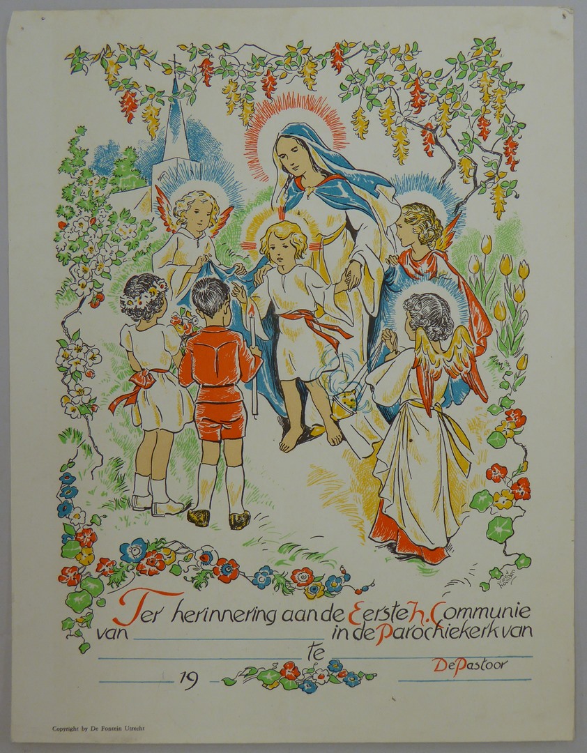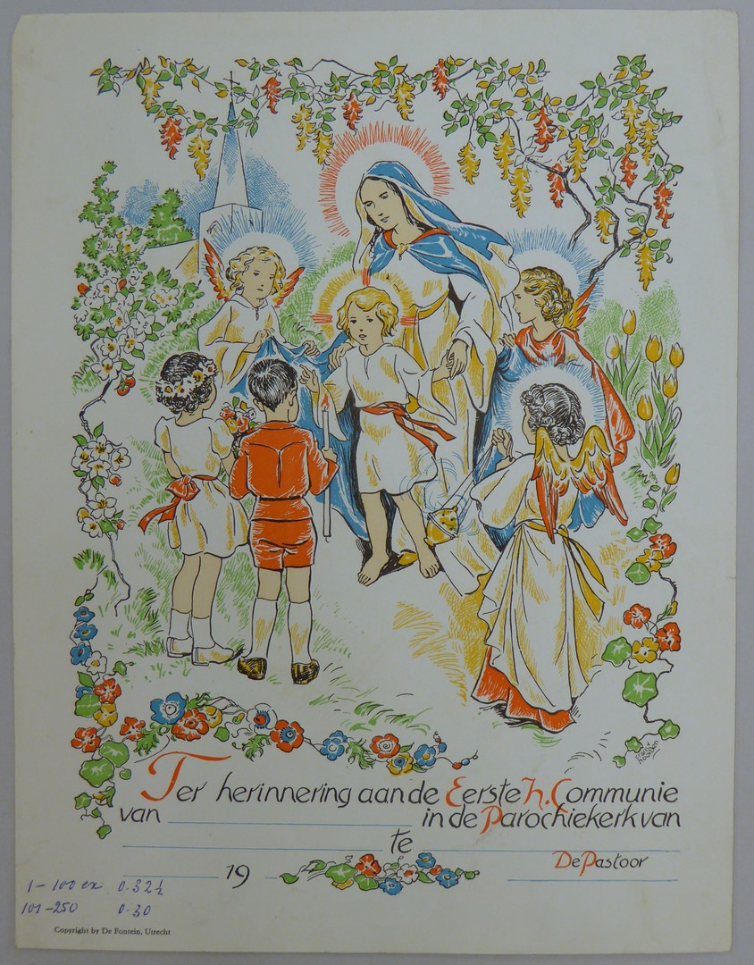 Communieprent (4 stuks): Maria met Christuskind omgeven door engelen, met twee communicantjes