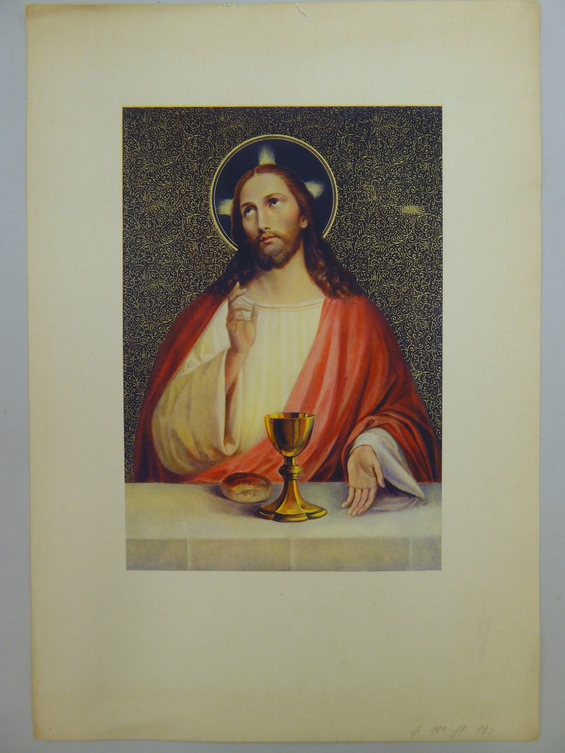 Communieprent met Christus achter tafel, gehuld in wit kleed en rode mantel, met kelk en hostie