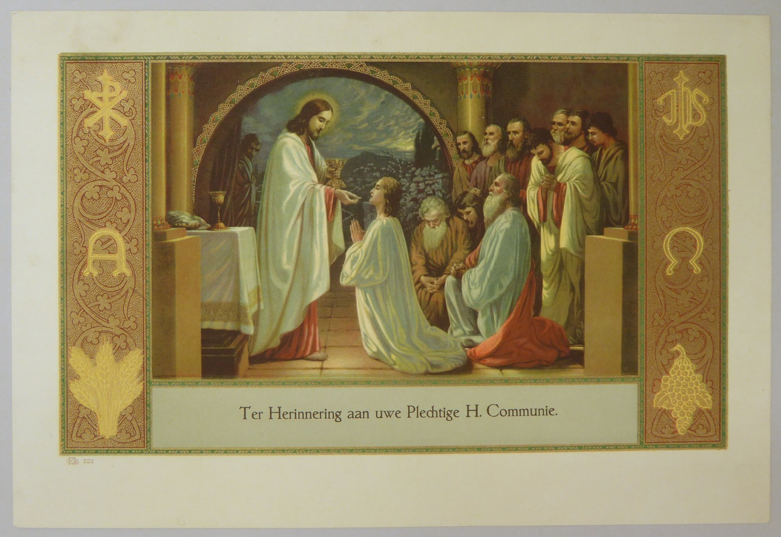 Communieprent met Christus die hostie aan Johannes en andere apostelen reikt, Judas kijkt toe