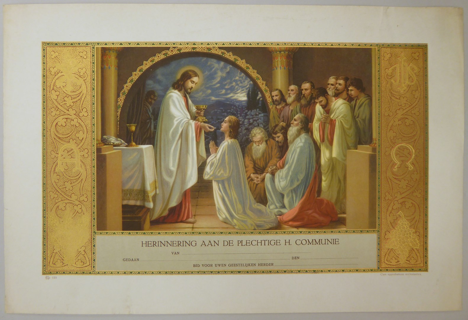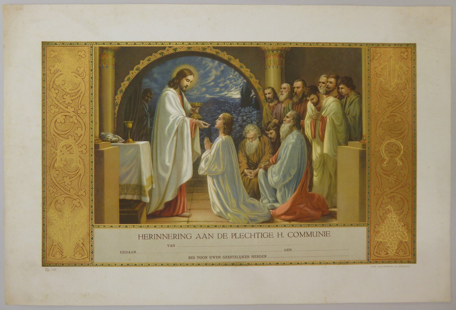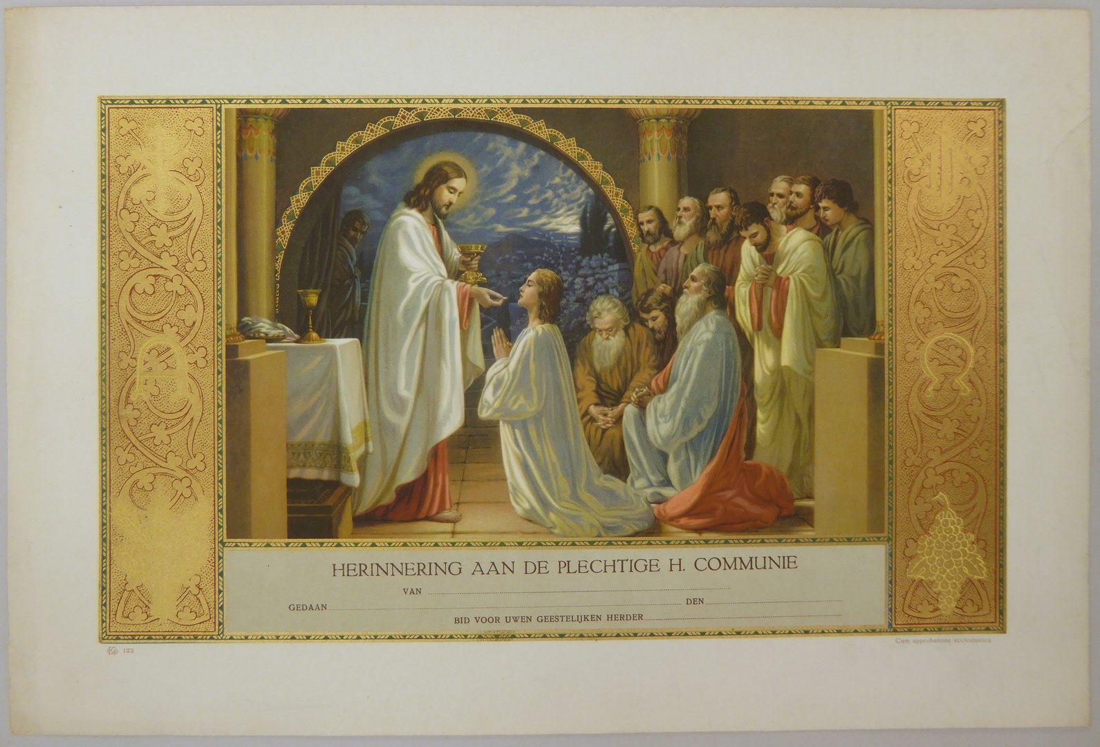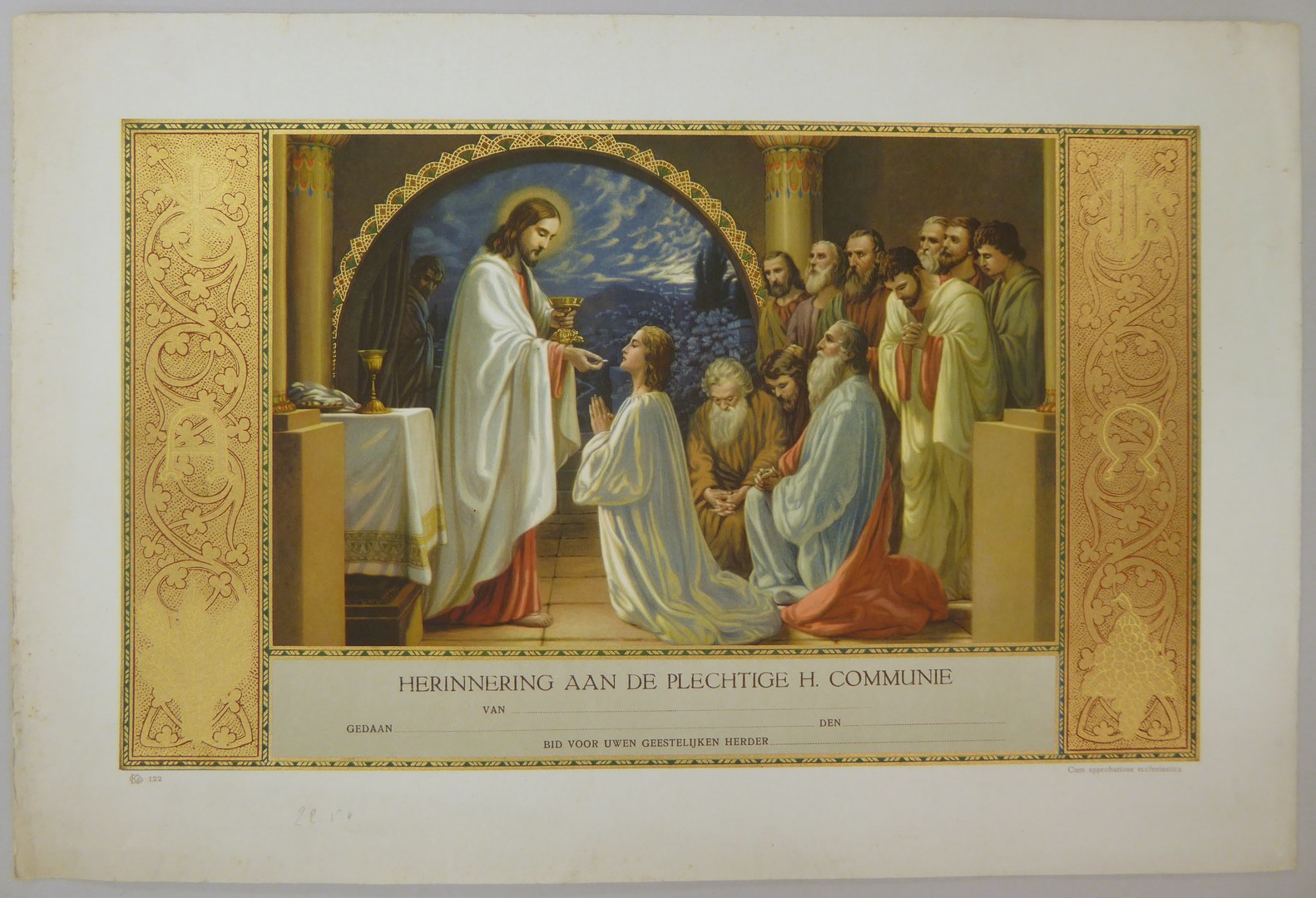 Communieprent (4 stuks): Christus die hostie aan Johannes en andere apostelen reikt, Judas kijkt toe