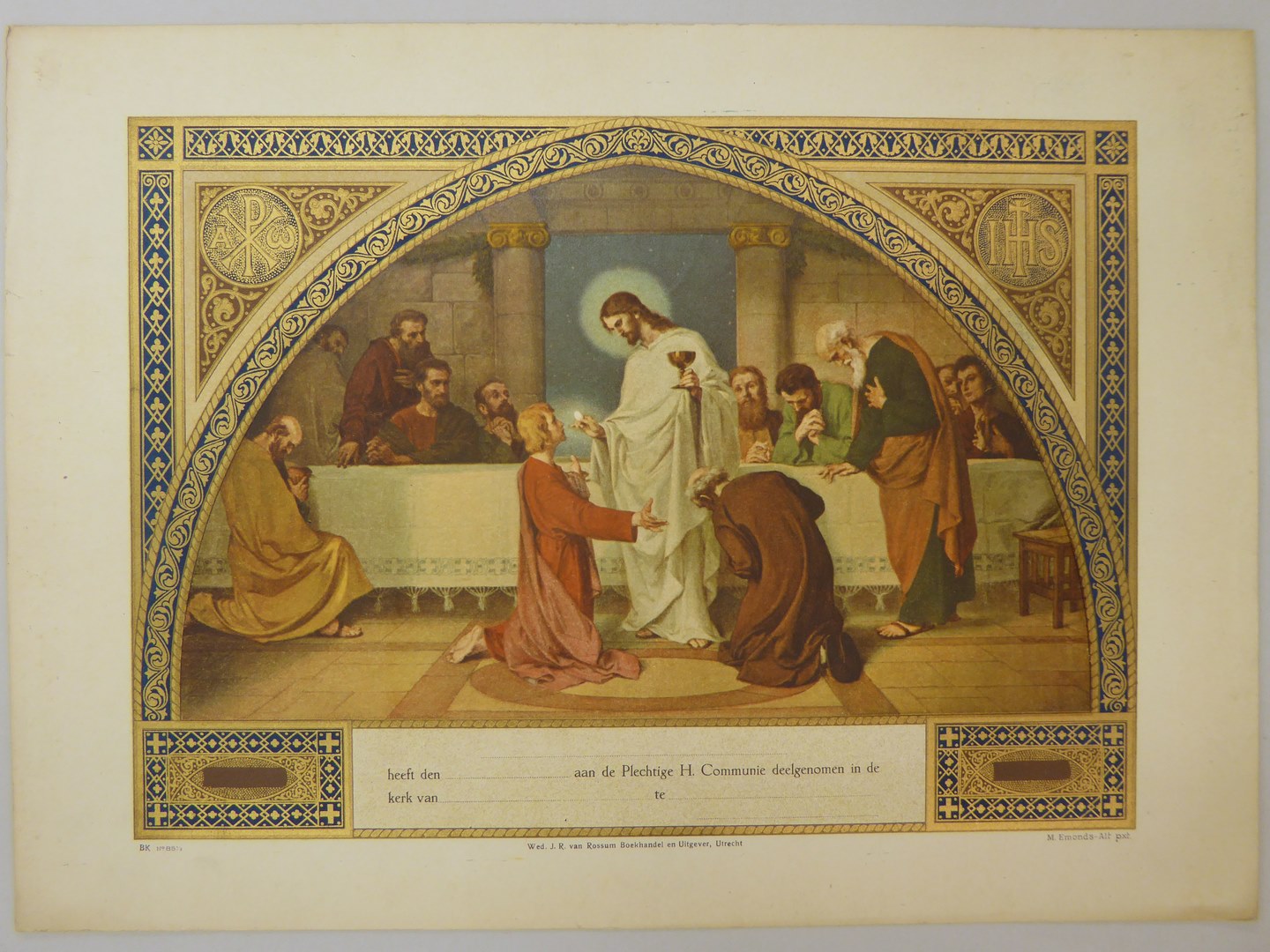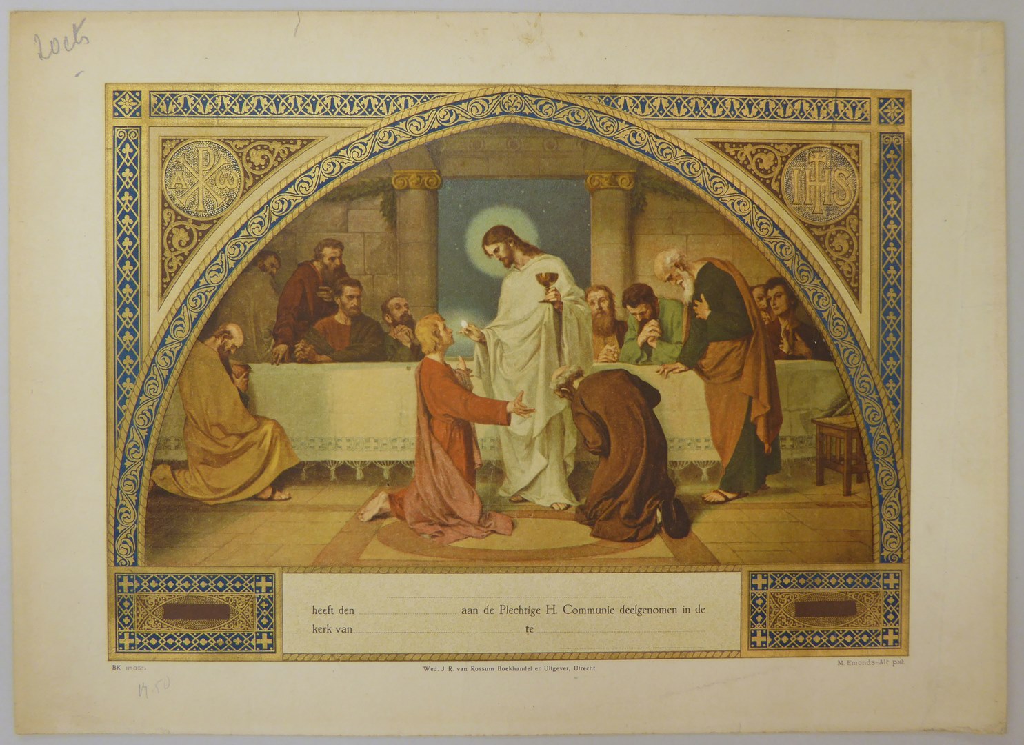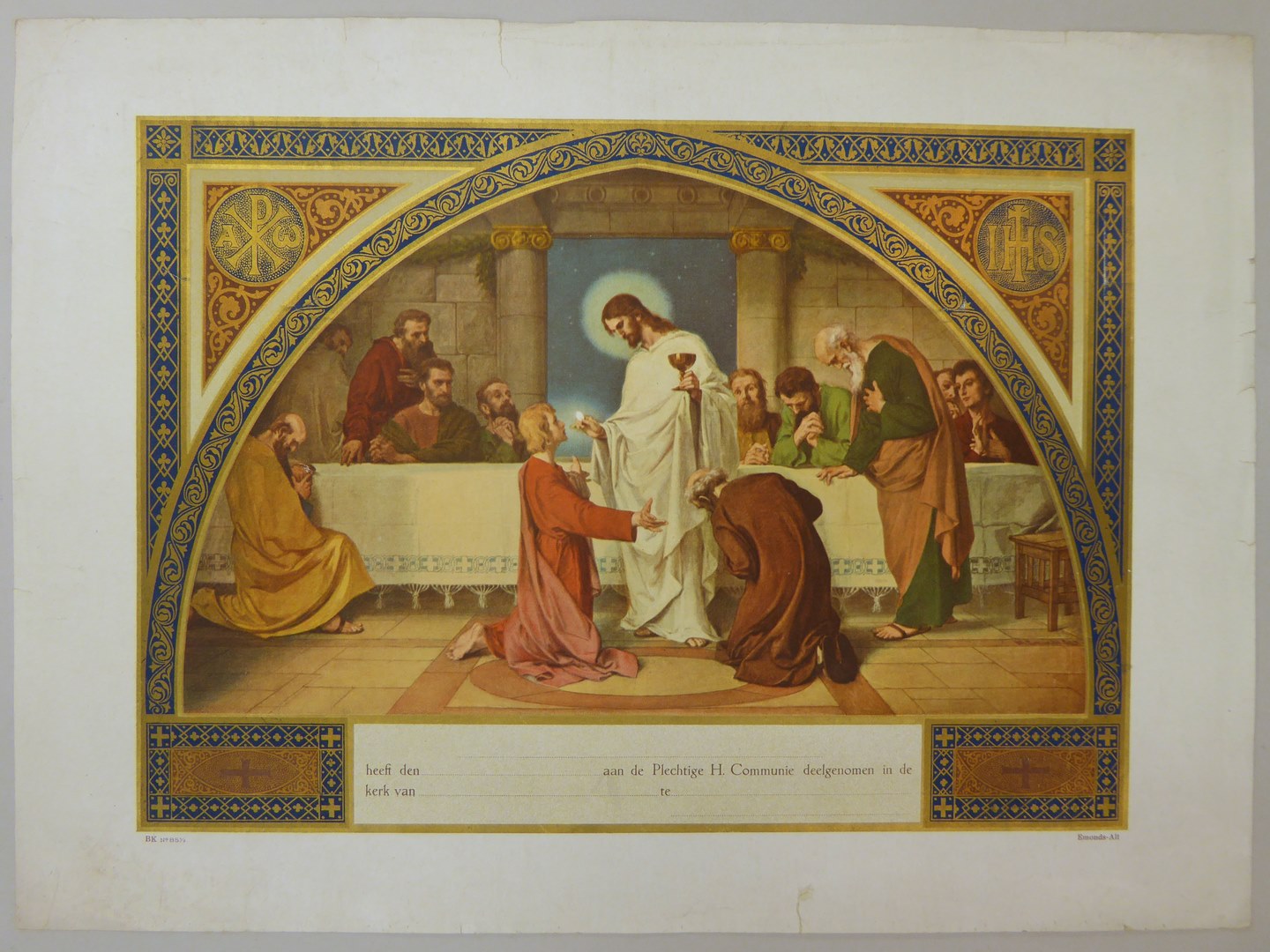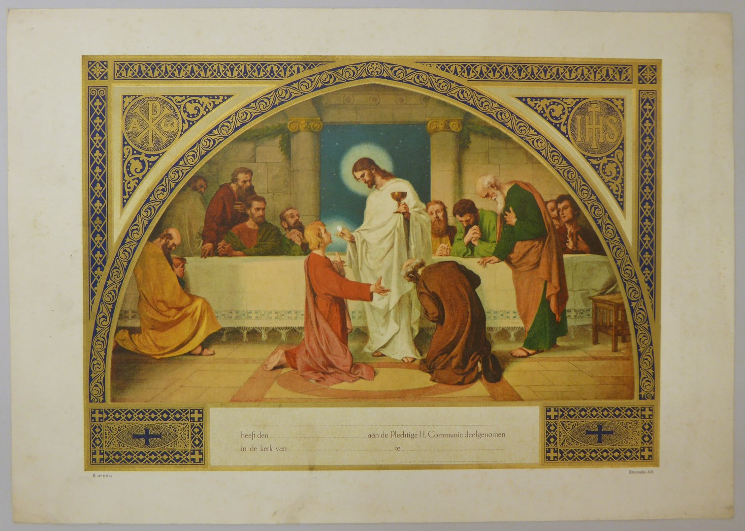 Communieprent (9 stuks): Christus met hostie en kelk voor knielende apostelen, overigen kijken toe