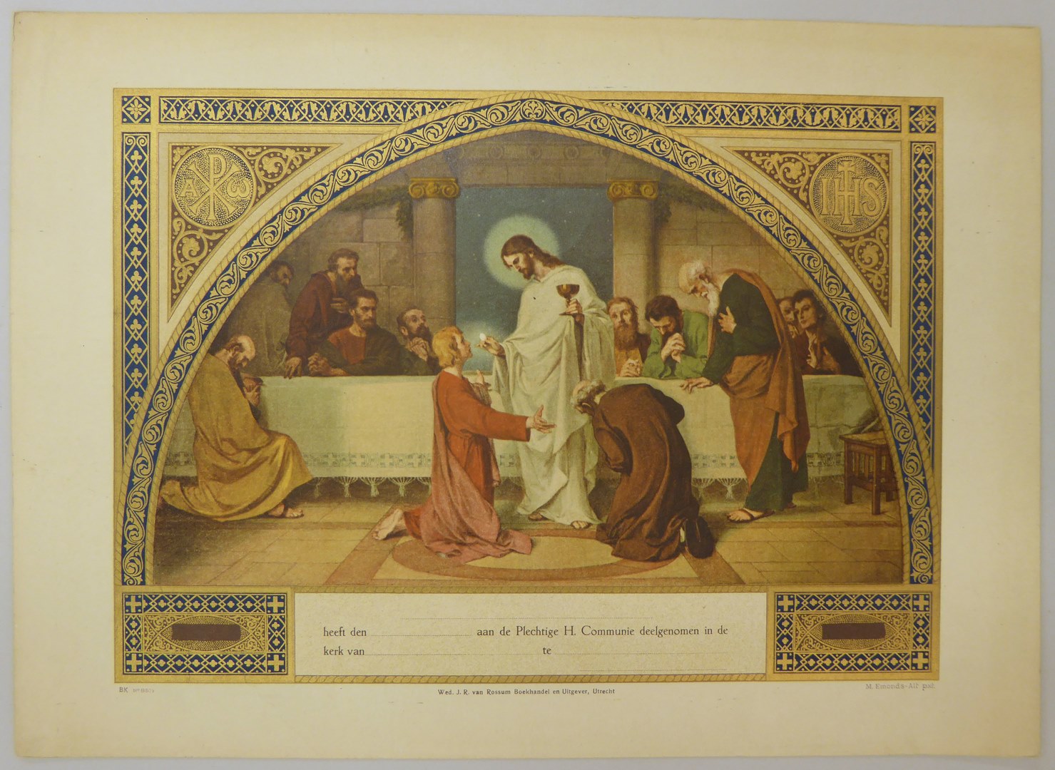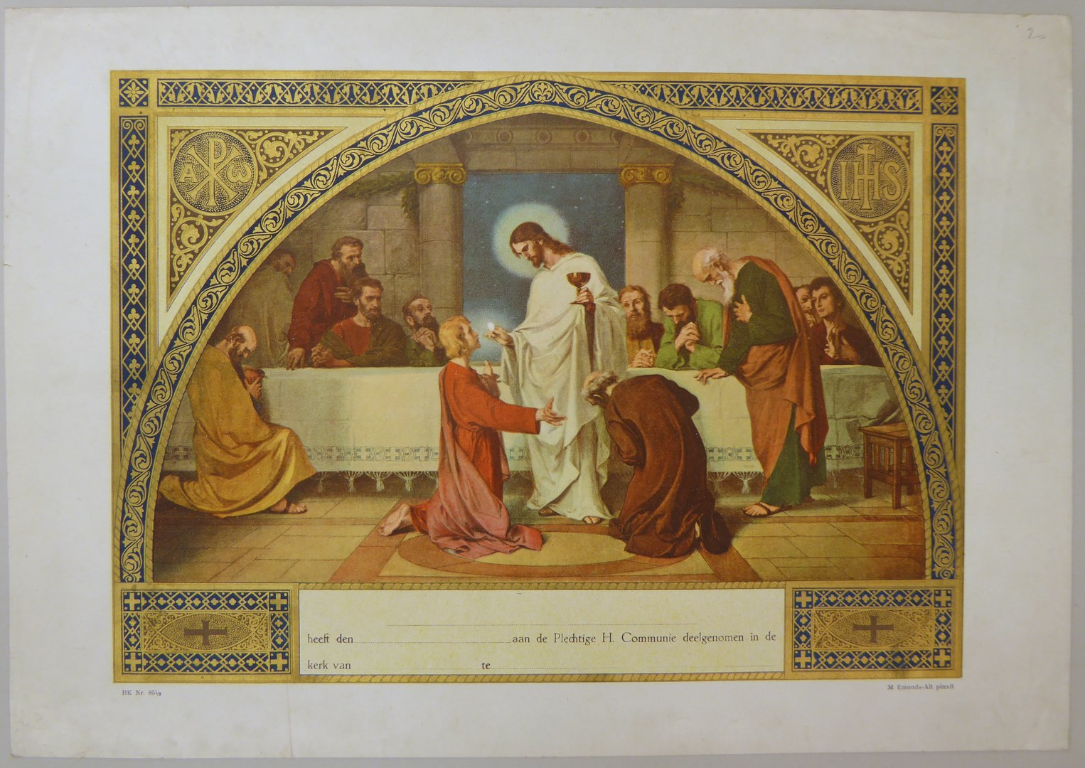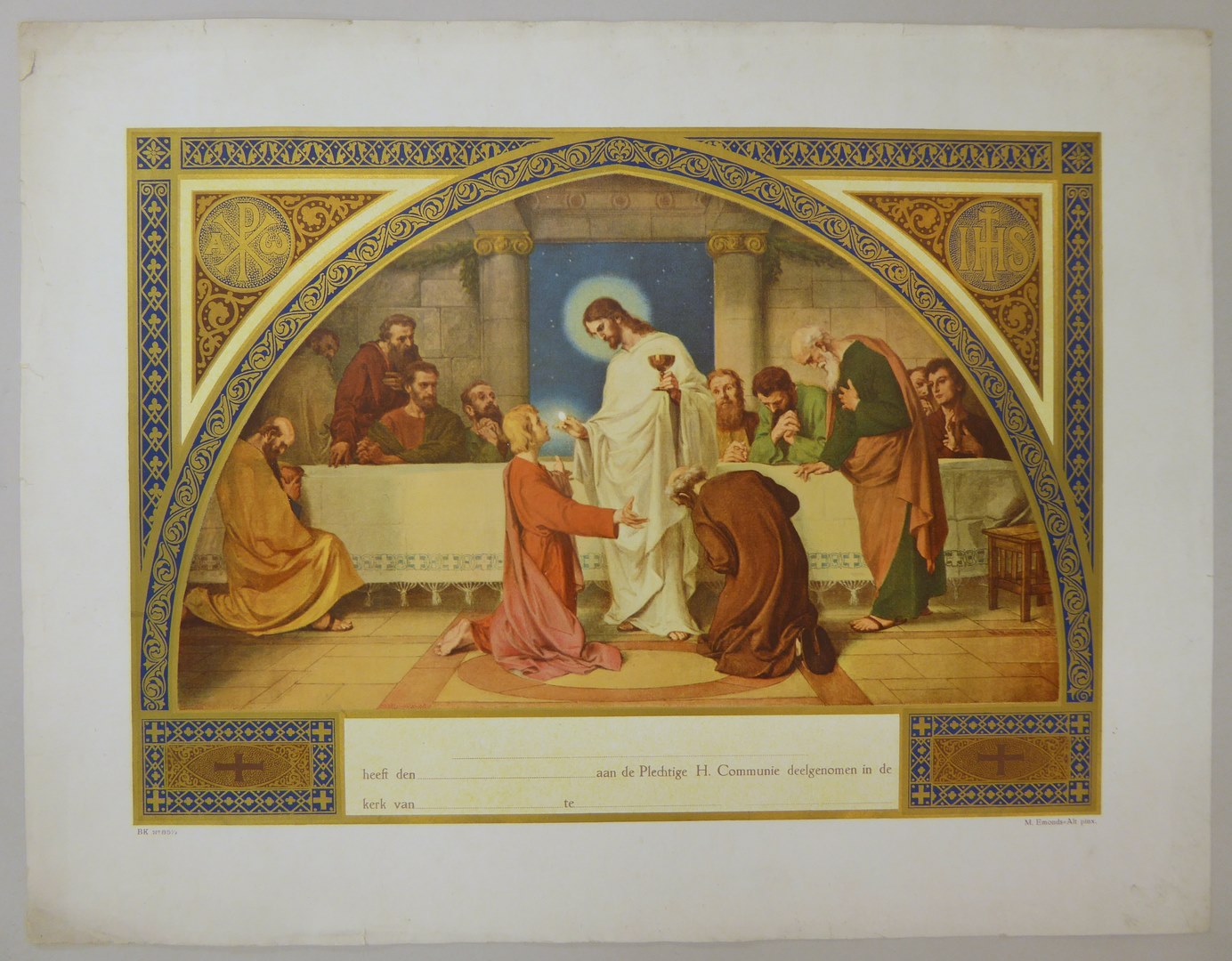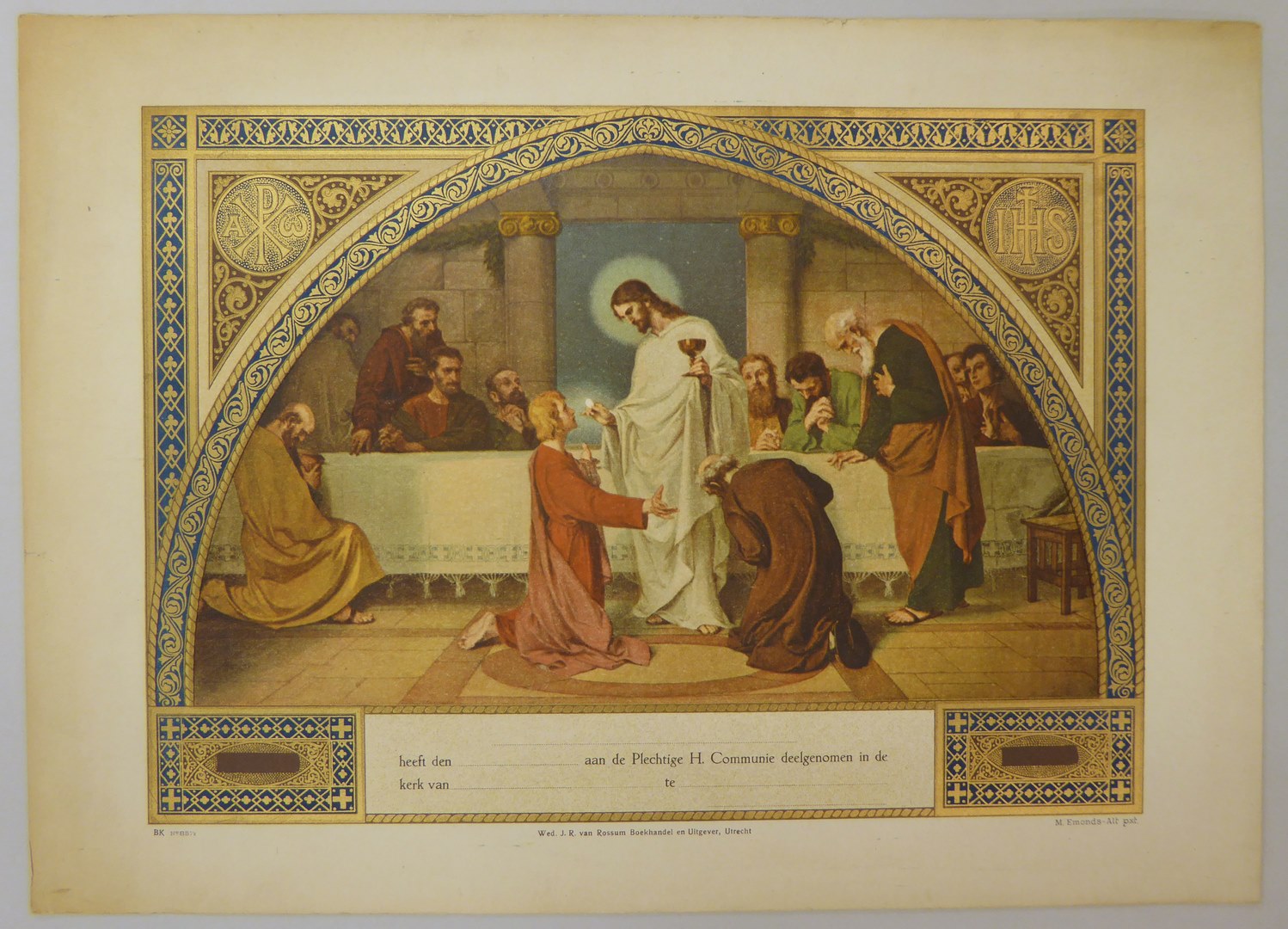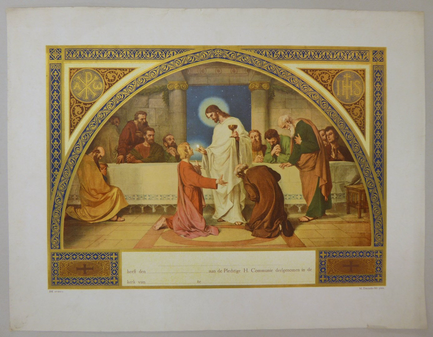 Communieprent (9 stuks): Christus met hostie en kelk voor knielende apostelen, overigen kijken toe