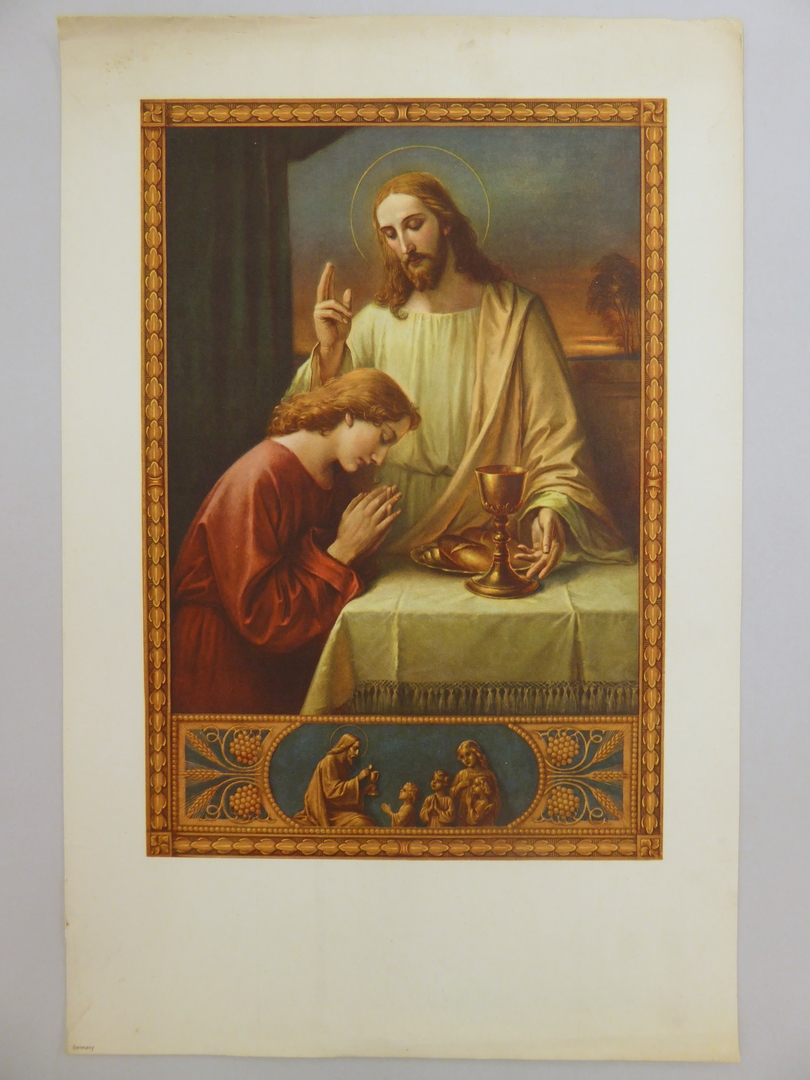 Communieprent met Jezus en Johannes met wijn en brood op gedekte tafel
