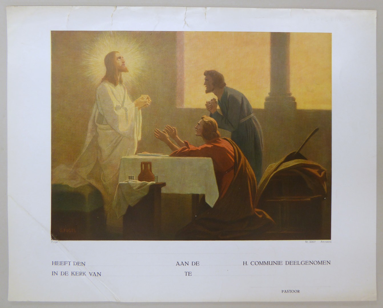 Communieprent met Christus die in het wit gekleed brood breekt voor twee apostelen