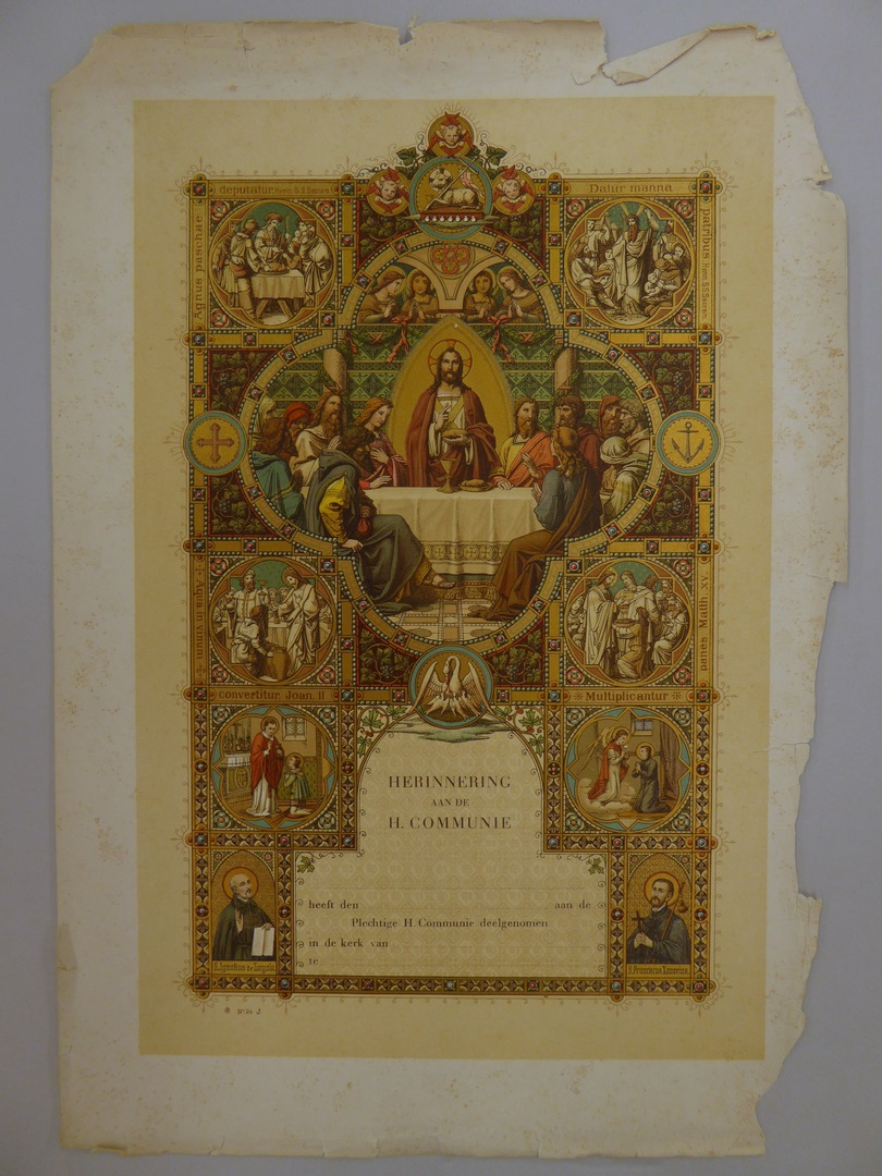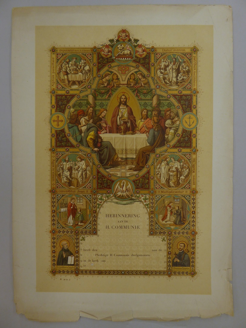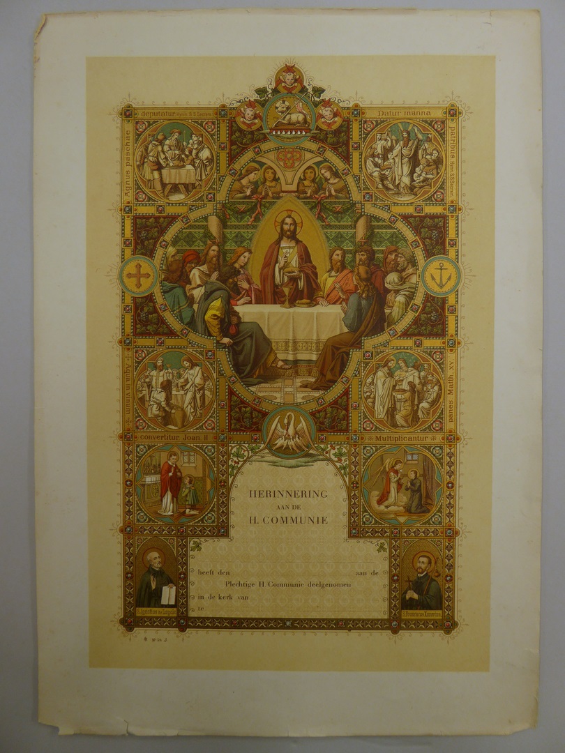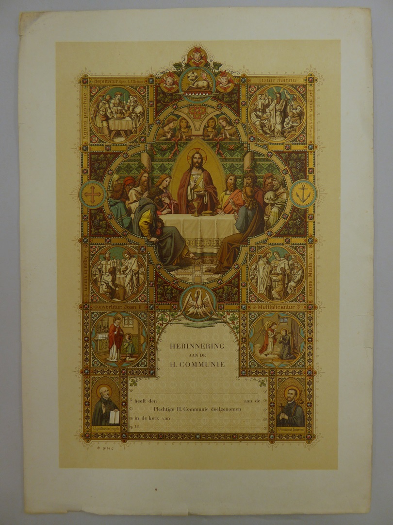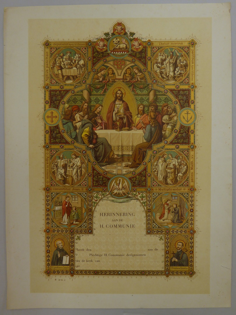 Communieprent (5 stuks) met Christus die brood zegent, met HH. Ignatius, Franciscus Xaverius