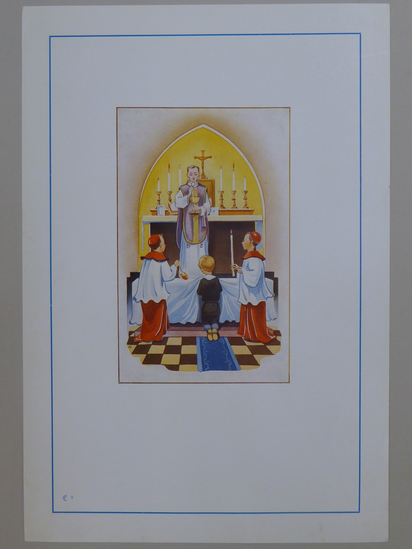 Communieprent met priester en jongetje dat ter communie gaat
