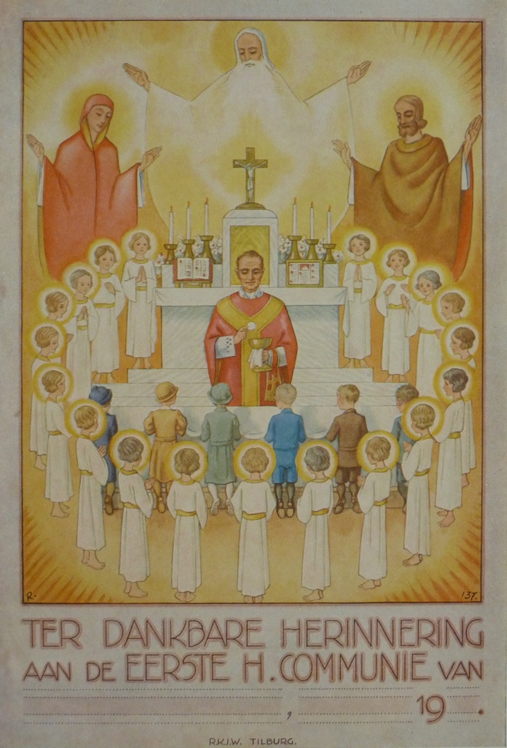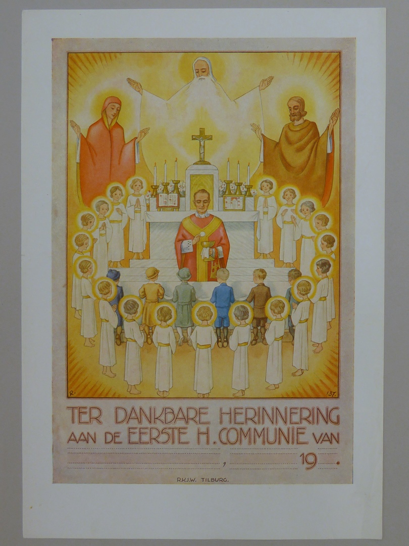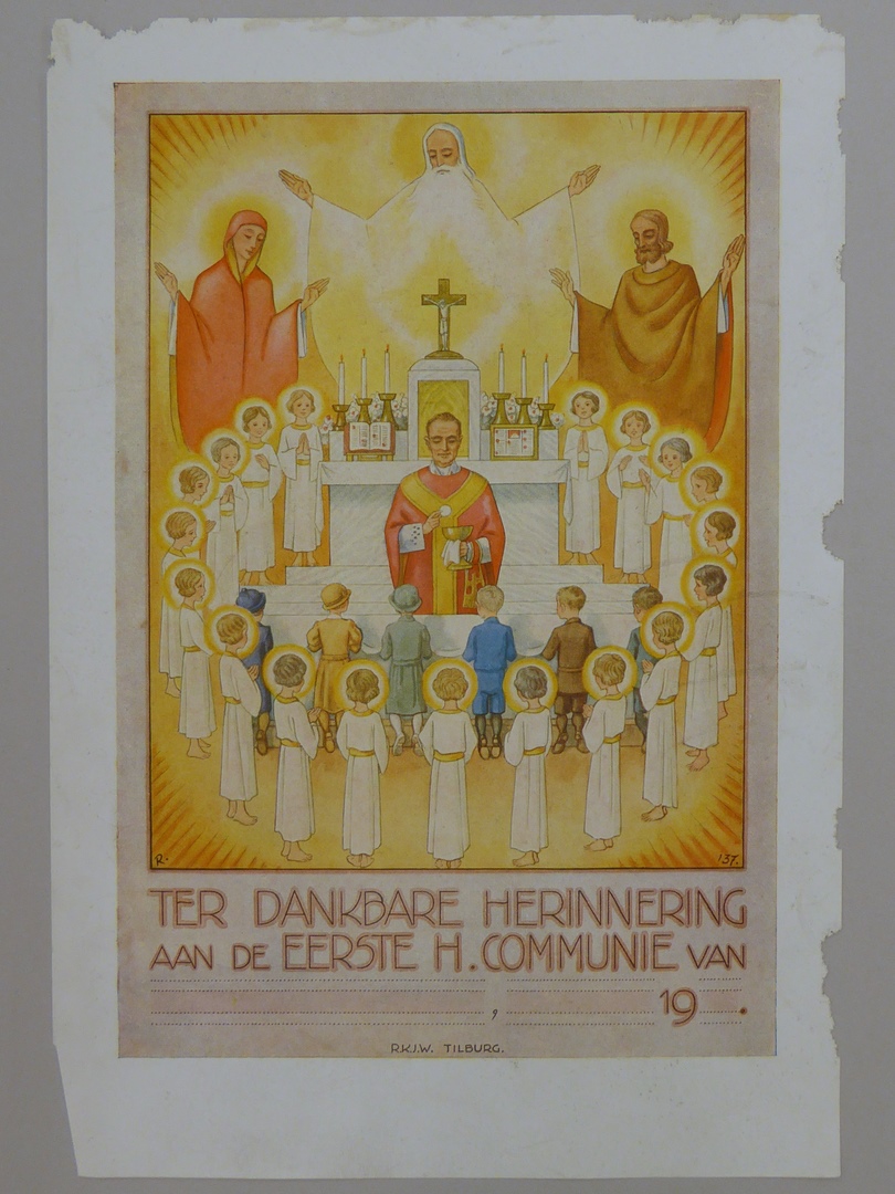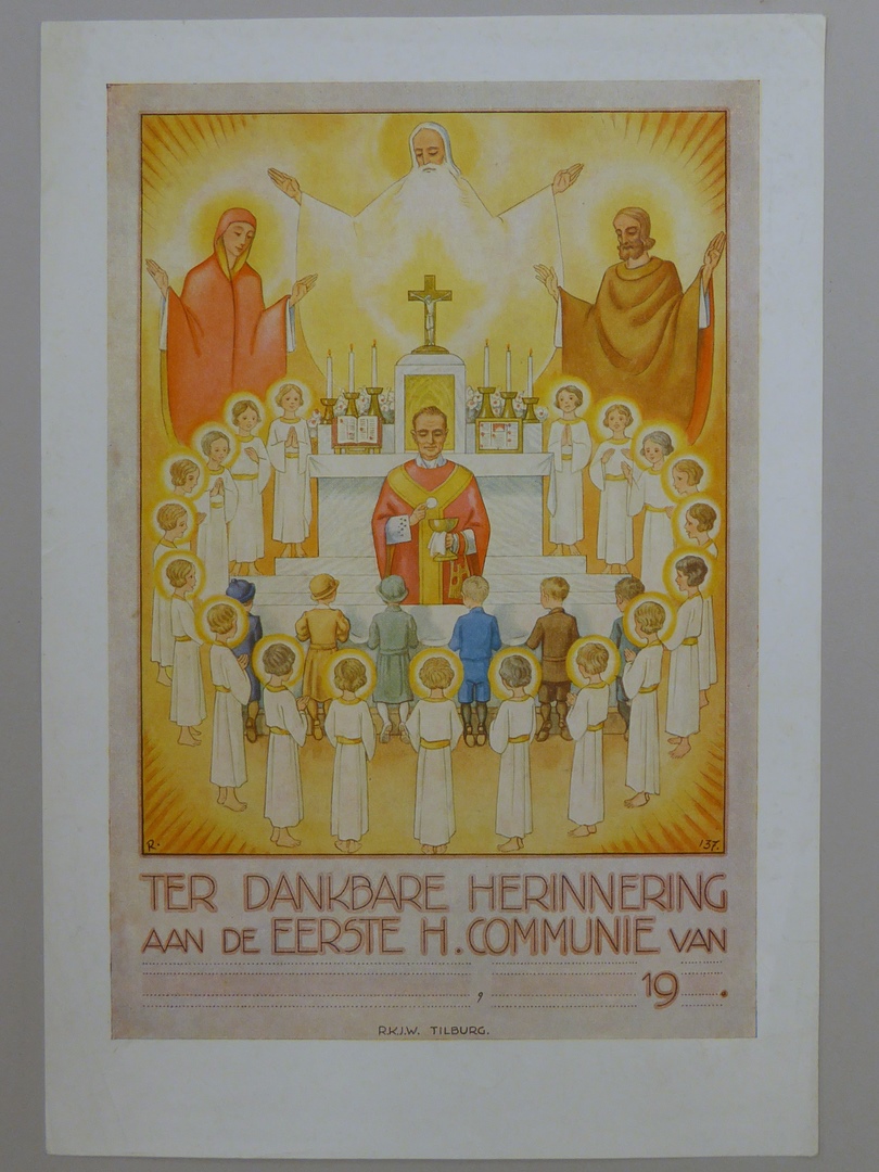 Communieprent (8 stuks) met priester die communie uitreikt aan zes kinderen, omringd door engelen