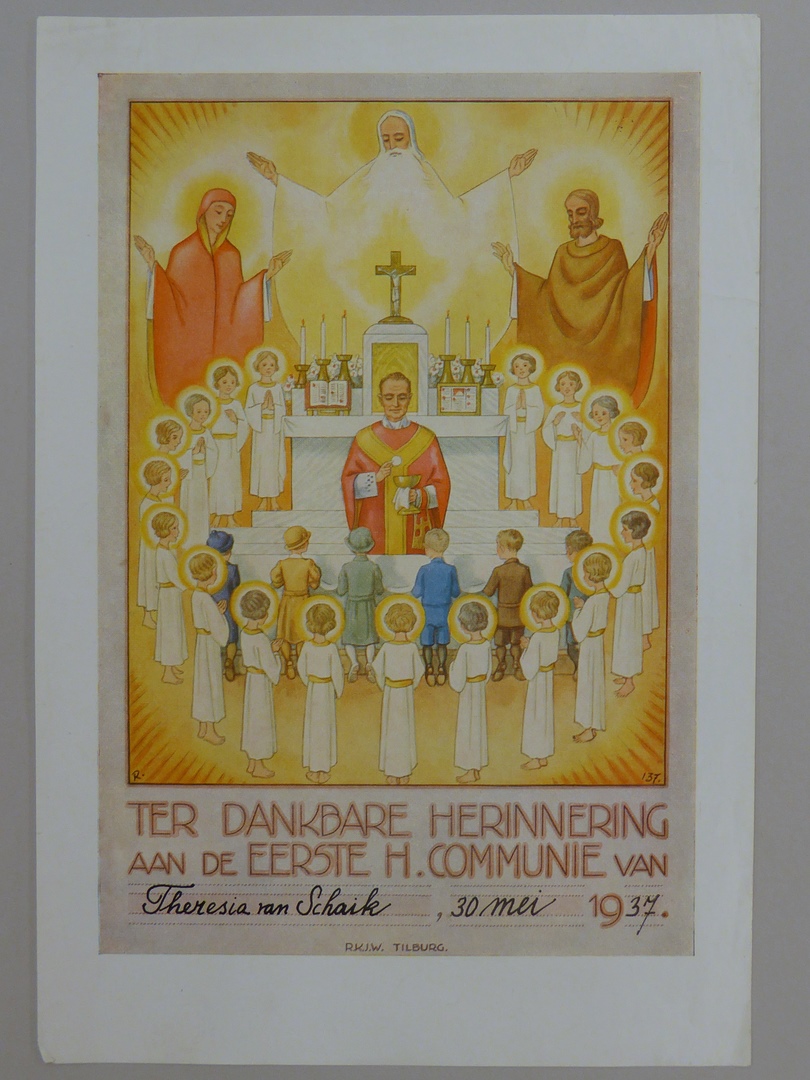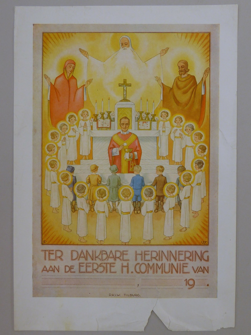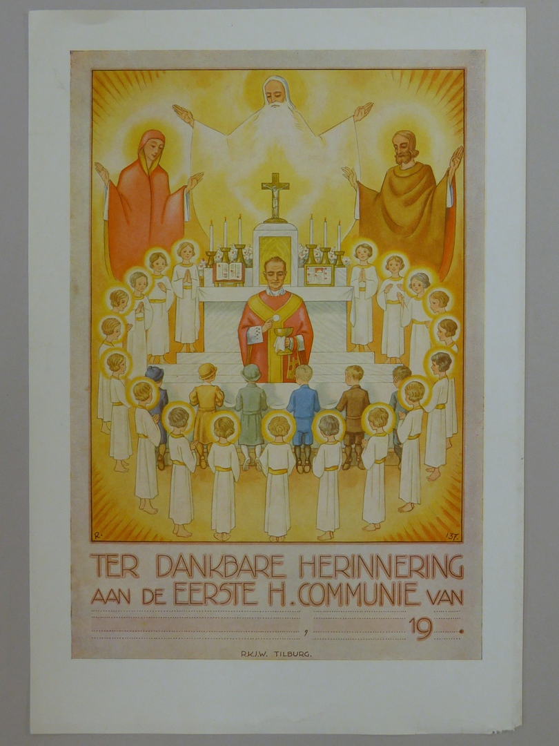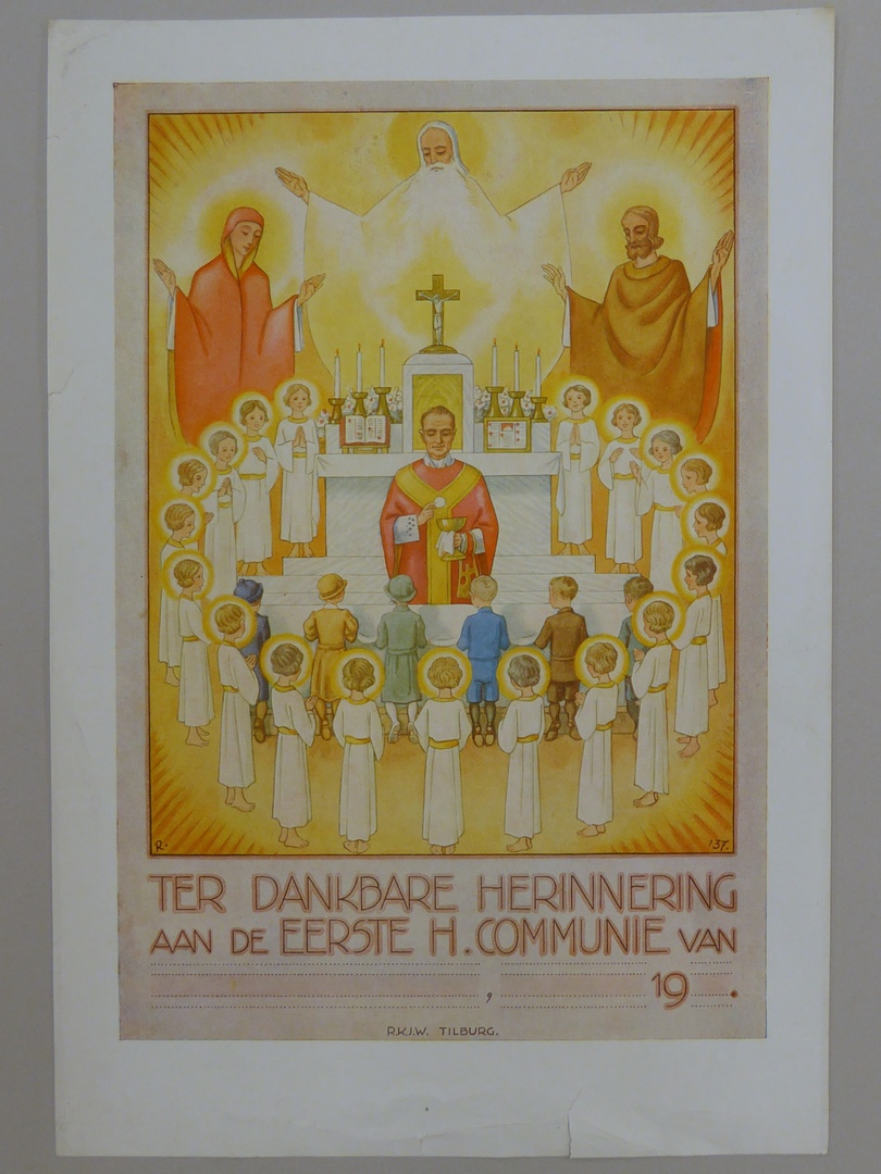 Communieprent (8 stuks) met priester die communie uitreikt aan zes kinderen, omringd door engelen