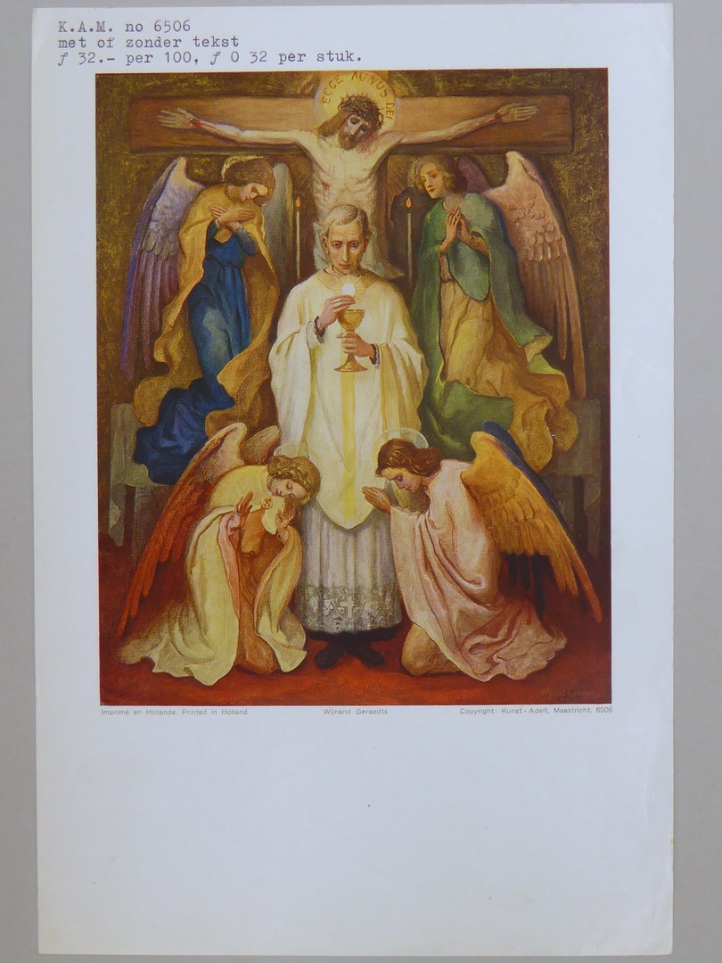 Communieprent met priester met hostie en kelk voor Christus aan het kruis